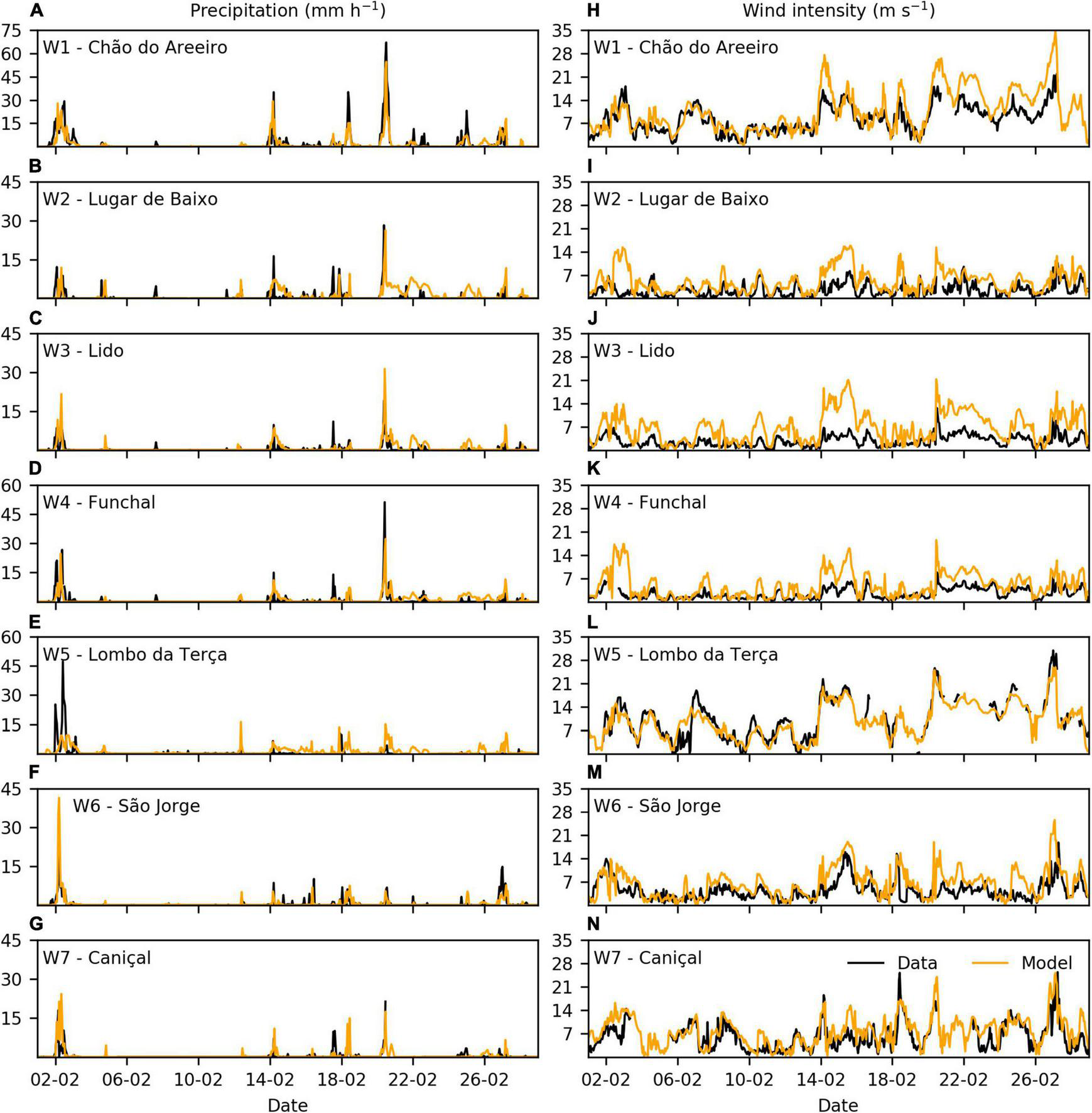 Comparison between the data recorded by the meteorological stations (black line) and the COAWST model results (orange line) for (A–G) precipitation (mm h–1; left panel) and (H–N) wind intensity (m s–1; right panel) during February 2010. Note the changes on the precipitation scales.
