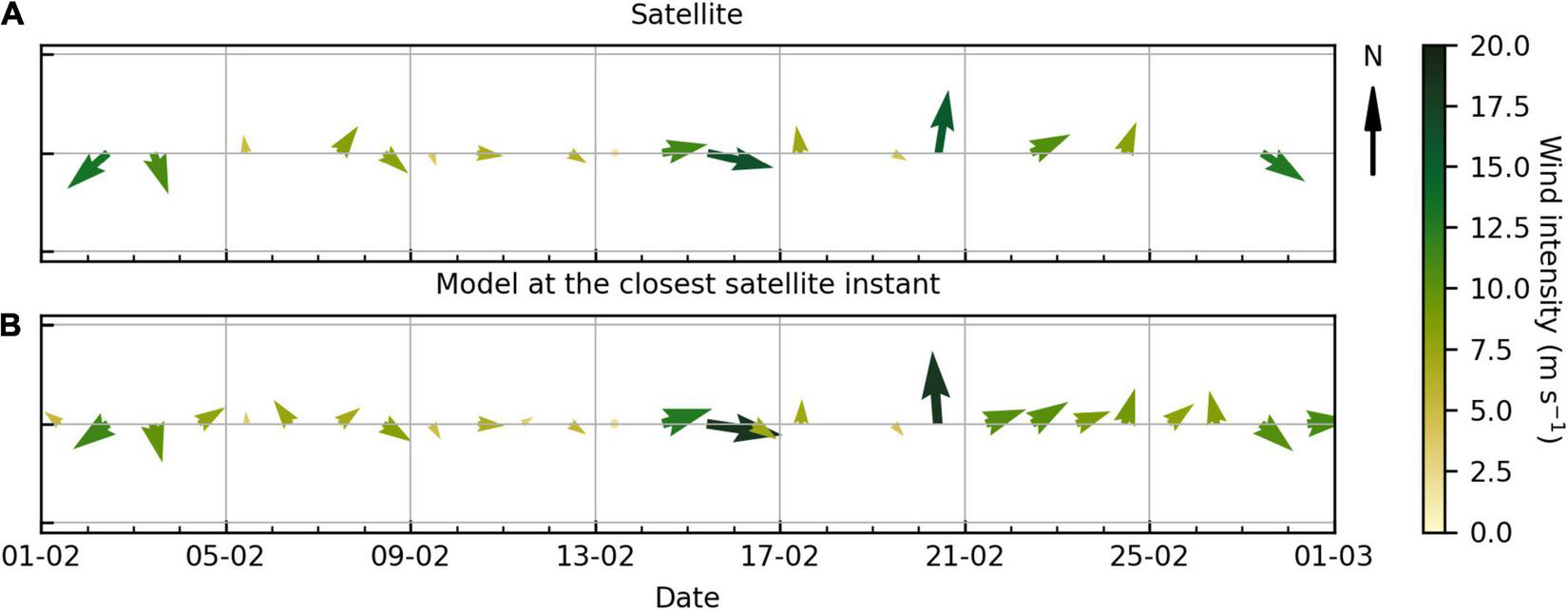 Comparison of D3 domain spatial average of wind direction and intensity (m s–1) from (A) ASCAT (descending satellite passage) and from (B) model simulations at the timestep closest to the time of the satellite passage.