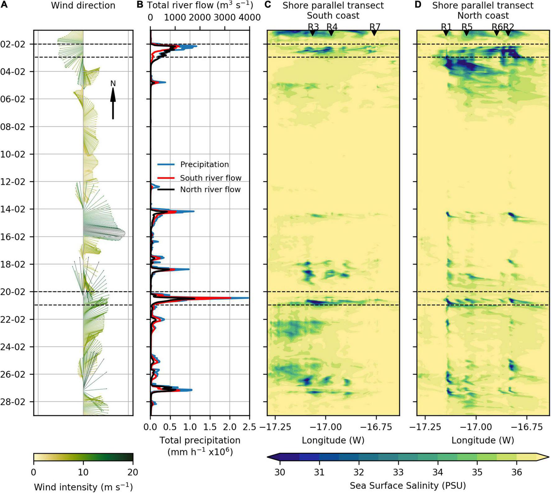 (A) Spatial average of WRF model wind direction and intensity (m s–1) for D3 domain, (B) total modeled river flow (m3 s–1) for rivers discharging in the south coast and north coast, along with the WRF model total precipitation (mm h–1) calculated for the island (red, black and blue lines, respectively), Hovmöller diagrams for the modeled Sea Surface Salinity (PSU) obtained from the shore parallel transects along (C) the southern shoreline and (D) northern shoreline during February 2010. The shoreline transects are positioned around 2 km from the coast and labels R1–R7 indicate the position of the main river outlets (see Figure 3C for transects and river outlets location). Black dashed lines identify two flash flood events.