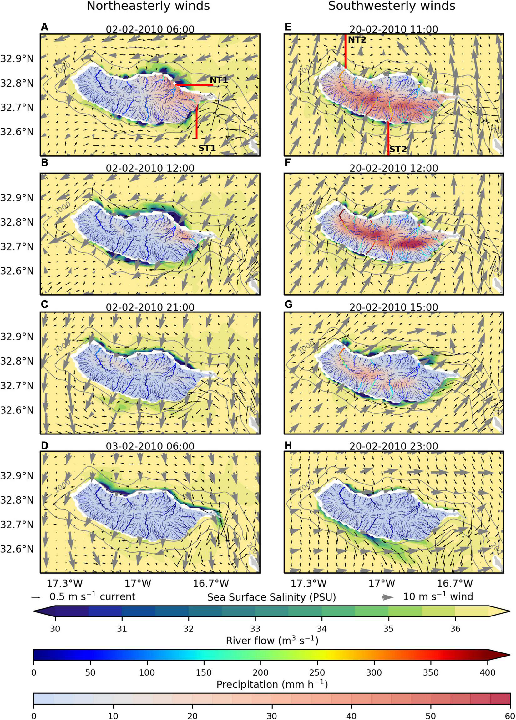 Temporal variability of wind, precipitation, river discharges, and sea surface salinity for February 2010 is shown in Figure 7. To analyze the prevailing wind direction and intensity, the wind field obtained from the coupled physical model was spatially averaged for the regional domain (D3; Figure 3B). As observed in Figure 7A, wind speed and direction varied quite significantly over the study period, changing anti-clockwise from south to southeast during the first 6 days, then turning clockwise and remaining with a westward orientation most of the time (varying between southwest and northwest direction). During the two periods of maximum rainfall, which corresponds to the 2nd and 20th of February (black dashed lines in Figure 7), prevailing winds had a northeast and southwest direction, respectively, reaching speeds typical of stormy weather conditions (∼ 15 and 20 m s–1, respectively). On these occasions, extreme volumes of rain fell over the island, such that the total daily precipitation during the 2nd and 20th of February 2010 accounted for 19 and 20% of the total monthly precipitation (blue line in Figure 7B). Hourly precipitation values higher than 0.5 mm h–1 prevailed 69% of the time.