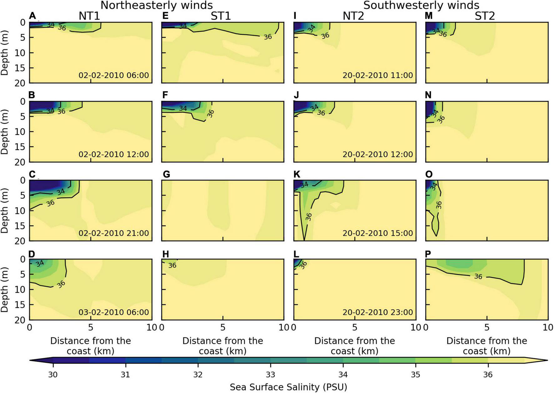 Considering that freshwater discharges, wind, ocean currents, bathymetry, and coastal geometry are some of the primary factors that determine the shape and size of river plumes (Horner-Devine et al., 2015), here we discuss the dynamics of the plumes based on snapshots of surface maps representing the variability of precipitation, river flow, wind, ocean currents, and sea surface salinity, while water column stratification and mixing processes are discussed based on vertical transects of salinity, Brunt–Väisälä Frequency and Richardson Number.