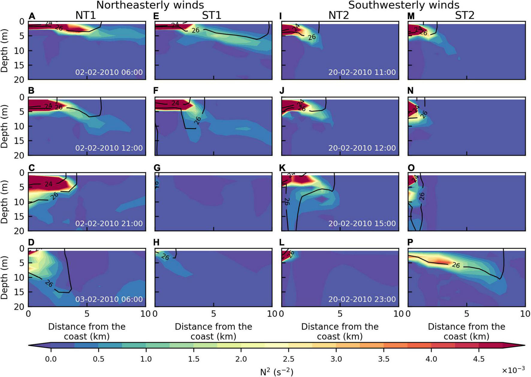 where g is the gravitational acceleration (9.8 m s–2), ρ0 is the reference density, ρ is the density calculated from temperature and salinity model outputs and ∂ρ/∂z is the vertical density gradient (thus, at the surface, N2 is equal to 0; Saldías et al., 2012). High Brunt–Väisälä values are indicative of vertical stratification.