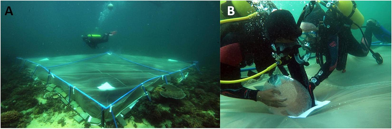 Larval mesh tent enclosure with frame attached onto reef (A), and divers adding concentrated A. tenuis larvae into a re-sealable portal on the mesh enclosure for settlement (B).