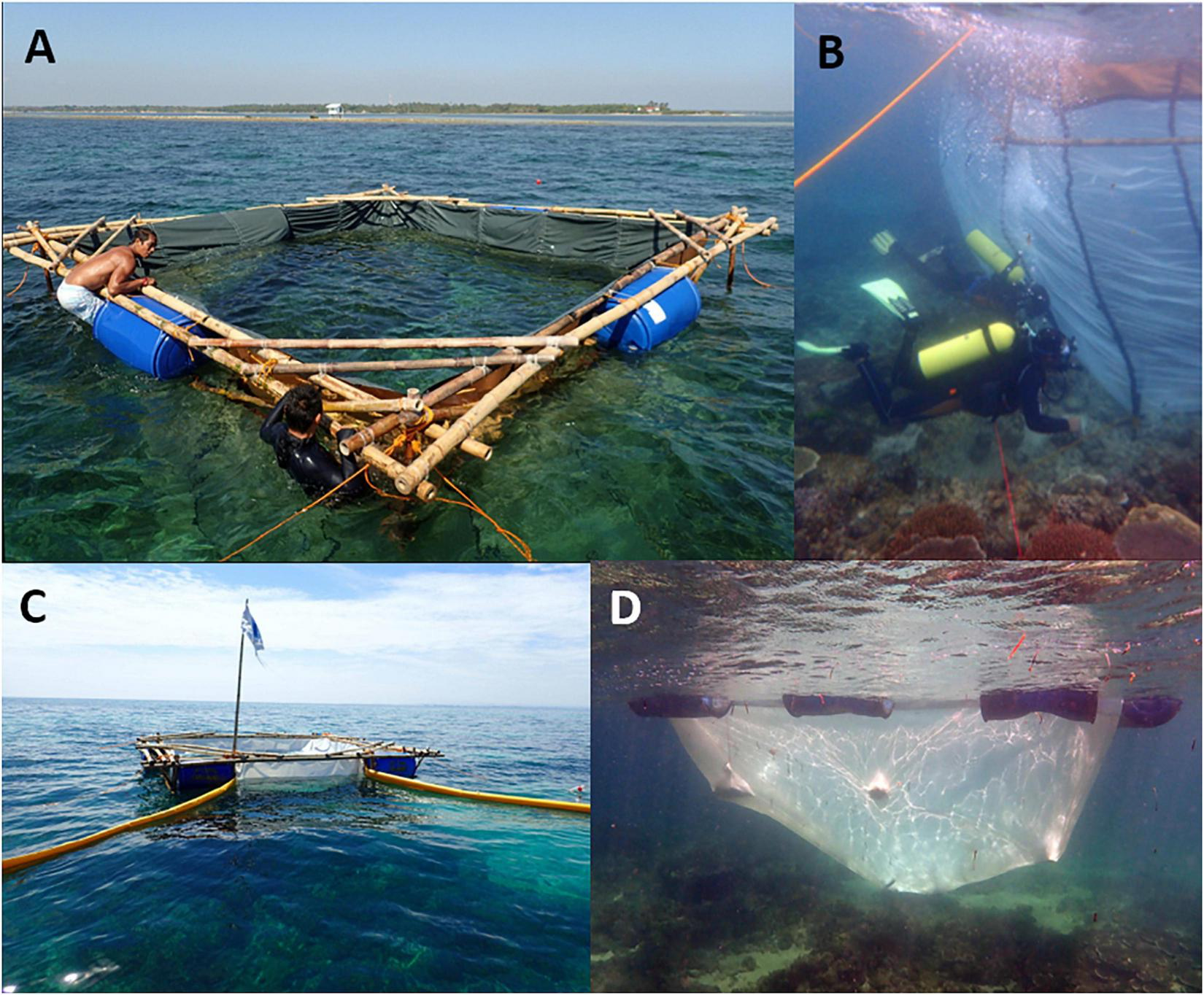 A prototype 5 × 5 m floating bamboo frame larval rearing pool deployed on Magsaysay reef in 2016 (A), and the submerged mesh curtain attached to the bamboo frame on reef site (B). Spawn catcher with booms attached to bamboo frame in 2017 on Magsaysay reef (C), and 2018 larval rearing net deployed under a floating steel frame (D).