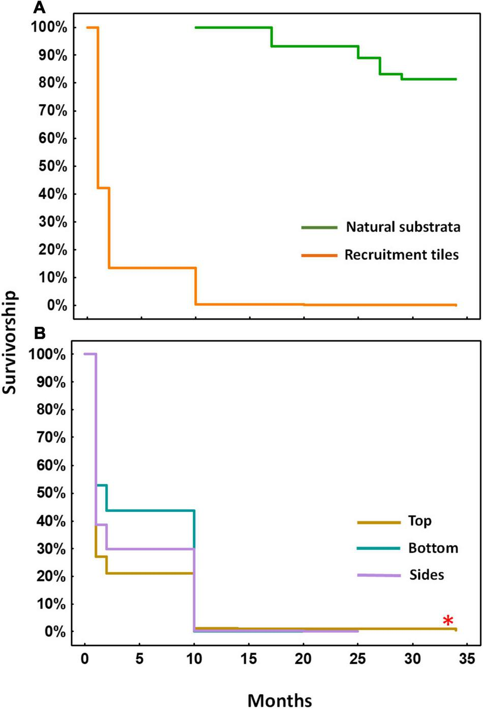 Kaplan-Meier survivorship over 34 months for settled A. tenuis polyps, juveniles and recruits in (A) larval enhanced plots on tiles (orange) and for visible recruits on natural reef substrata (green) starting at 10 months after larval settlement, and (B) survivorship of recruits on different tile surfaces in the larval enhanced plots. Asterisk denotes significant difference between tile surfaces.