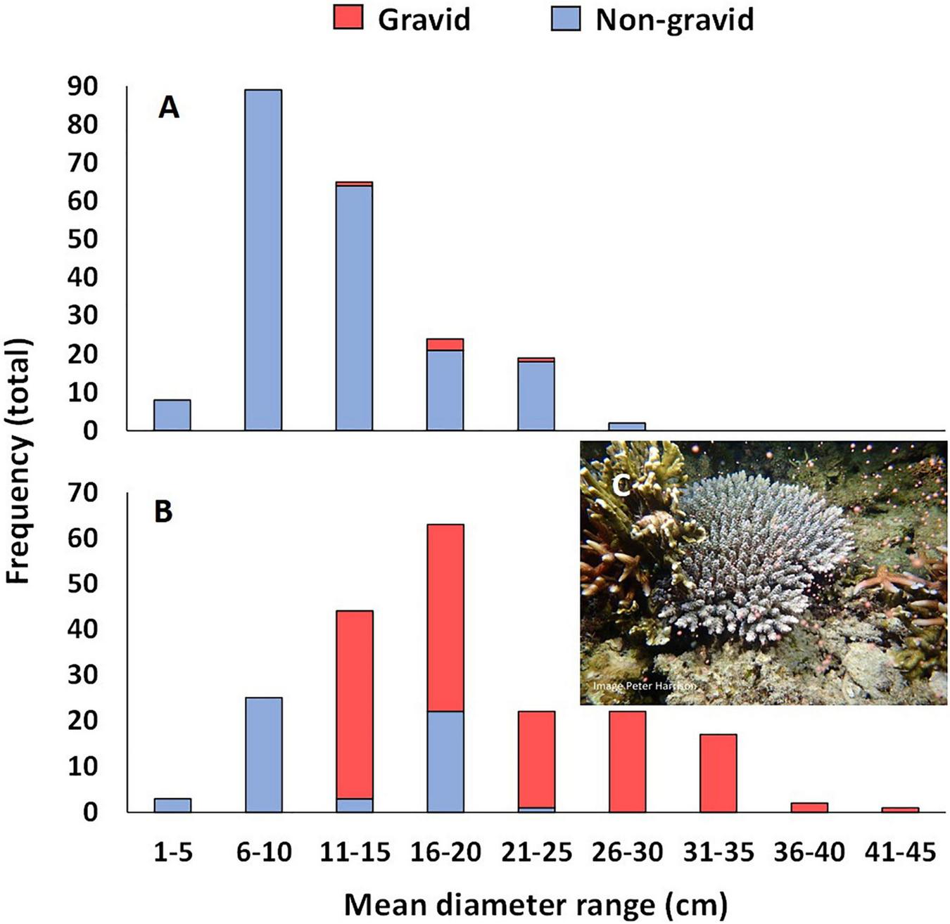 Size frequency plots of mean colony size of gravid and non-reproductive A. tenuis colonies in the three larval enhanced plots (A) in June 2018 and (B) March 2019, and (C) a three year old colony spawning in a larval restoration plot on 25 April 2019.