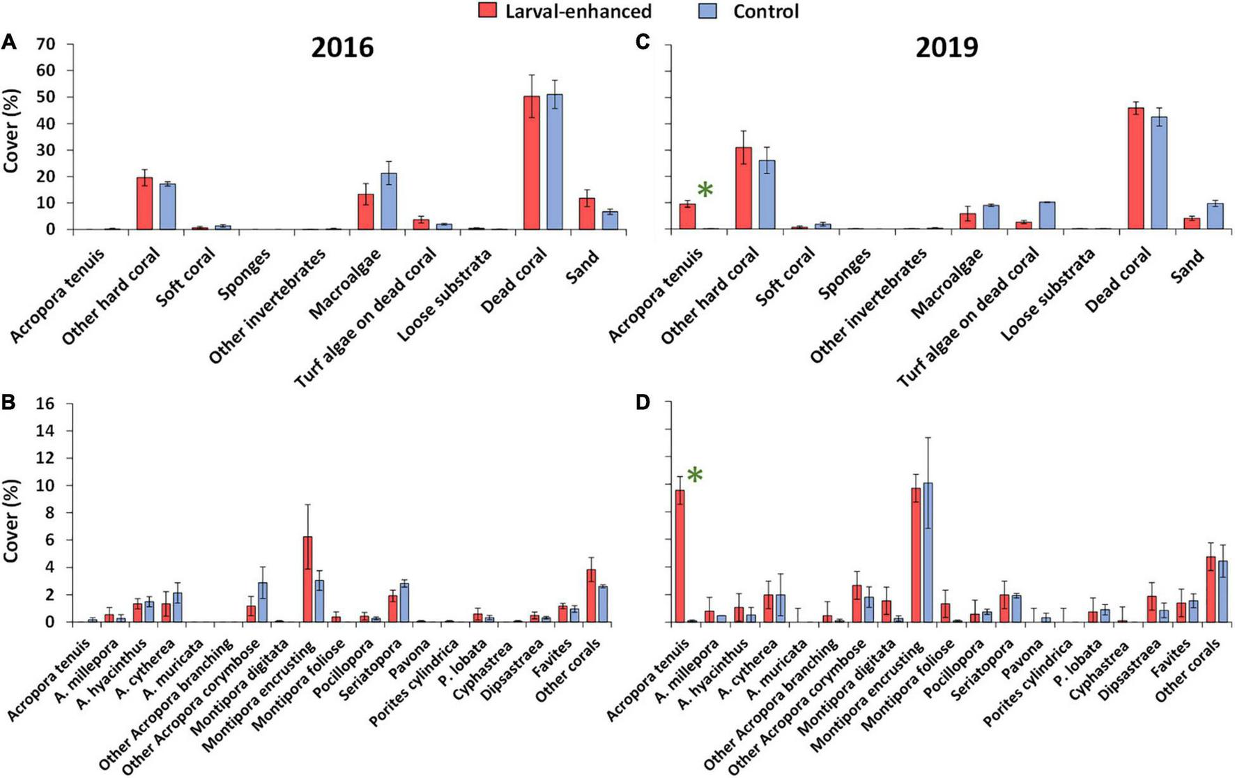 Mean percentage cover of major benthic categories prior to larval enhancement in 2016 (A) and 35 months after larval enhancement in 2019 (B), also mean percentage cover of coral categories prior to larval enhancement in 2016 (C) and 35 months after larval enhancement in 2019 (D). Error bars are ± SE. N = 3 for both larval enhanced and control plots. Asterisk denotes significant difference in mean cover of A. tenuis between larval-enhanced and control plots.