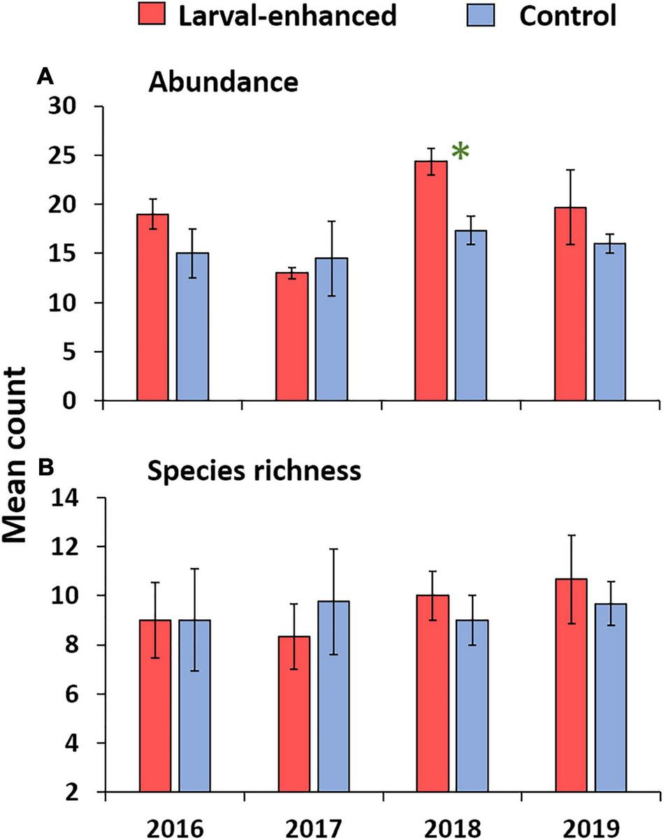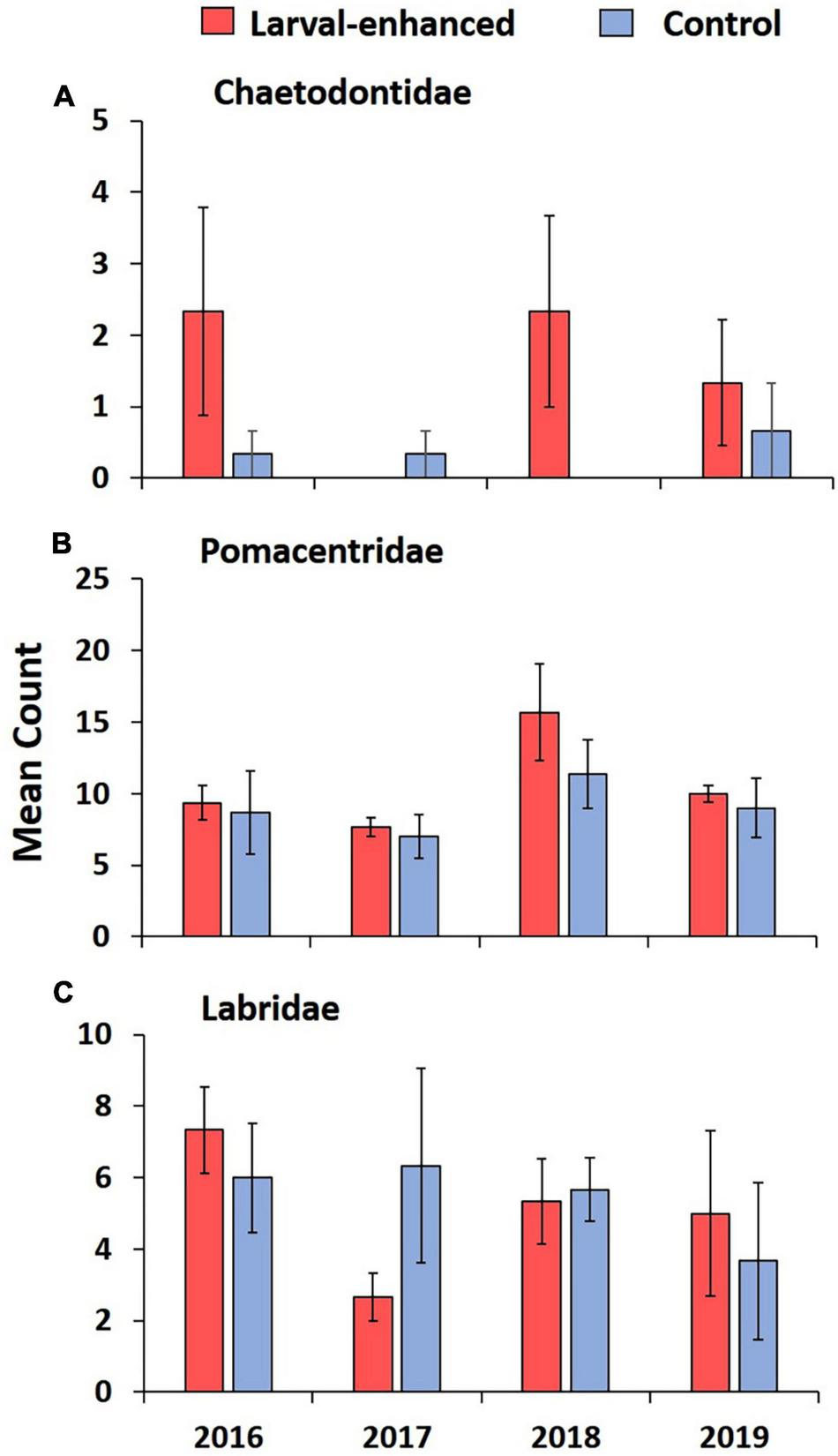 Surveys of fish assemblages in 2016 showed similar low mean fish abundance and species richness in all experimental plots before the larval restoration experiment due to the degraded status of the reef. There were no significant differences between control and larval enhancement plots for fish abundance (Figure 10A; F = 2.7; P = 0.54) or fish species richness (Figure 10B; F = 1.86, P = 0.70) prior to the larval enhancement experiment. Pomacentridae and Labridae were the most abundant fish families, and had similar mean abundance in the larval enhanced and control plots in 2016, with low numbers of Chaetodontidae corallivores present (Figure 11).