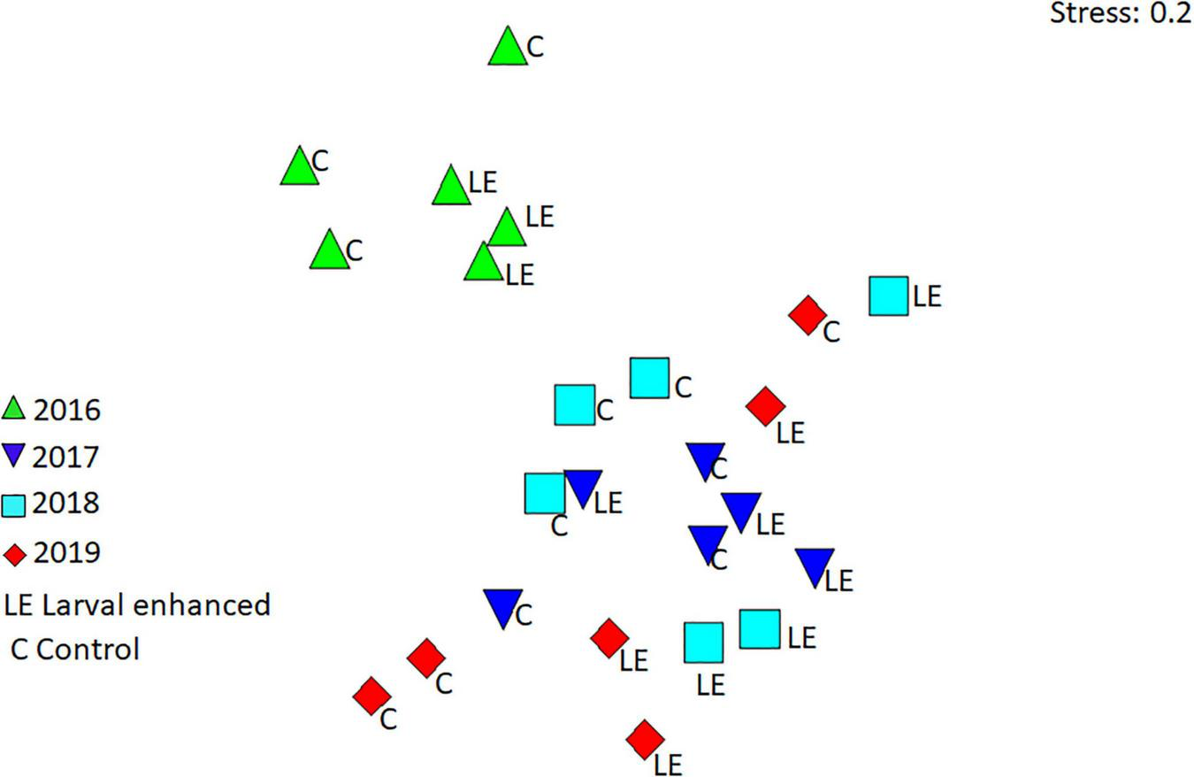 Differences in fish species richness and fish abundance between larval enhancement and control plots were analysed using Mann-Whitney U-Test in Statistica ® software. Fish species composition between larval enhancement and control plots both before and three years after the larval restoration was graphically presented in two-dimensional ordination plots by non-metric multidimensional scaling (nMDS) using the Bray-Curtis measure of similarity (PRIMER v6). Data were transformed to fourth root so that each species contributed evenly to each analysis. Two-way ANOSIM (analysis of similarity) with pair-wise comparisons was conducted to formally test the significant differences between controls and each treatment. Similarity percentage procedure (SIMPER) was also employed to identify the fish species that contributed to the dissimilarities.