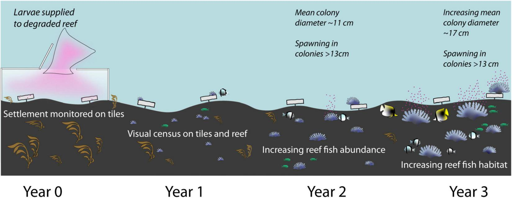 An alternative approach is larval enhancement whereby larvae are settled directly onto reef areas or artificial surfaces in situ, which increases the chances of successful settlement in preferred microhabitats and improved genotype-environment matching (Harrison et al., 2016; Harrison, 2021). However, relatively few studies have used this approach, and the initial studies were done on healthy reefs with naturally high larval supply and recruitment (Heyward et al., 2002; Suzuki et al., 2012; Edwards et al., 2015). Additionally, monitoring of settlers’ survival, growth and recruitment was performed for periods of six weeks (Heyward et al., 2002), six months (Suzuki et al., 2012) and approximately 13 months (Edwards et al., 2015). Therefore, these studies were unable to determine the longer-term restoration outcomes of the approach.