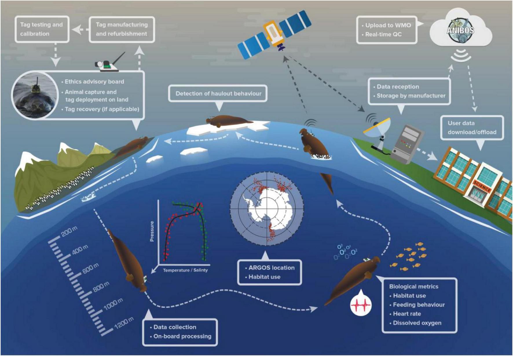 Animal Borne Ocean Sensors is the culmination of decades of scientific endeavor and technological development enabling a variety of biological and physical sensors to be incorporated into small data-logging or data-transmitting devices deployed on marine animals (Fedak et al., 2002; Fedak, 2013; Hussey et al., 2015). The number of species, studied and the amount of data being collected has proliferated in the last two decades (Fedak, 2013), requiring centralized coordination and management of metadata and data collections, and the creation and use of best practices, particularly in relation to data quality control and animal welfare. These activities will be the primary role of AniBOS. Here we present an overview of AniBOS1.