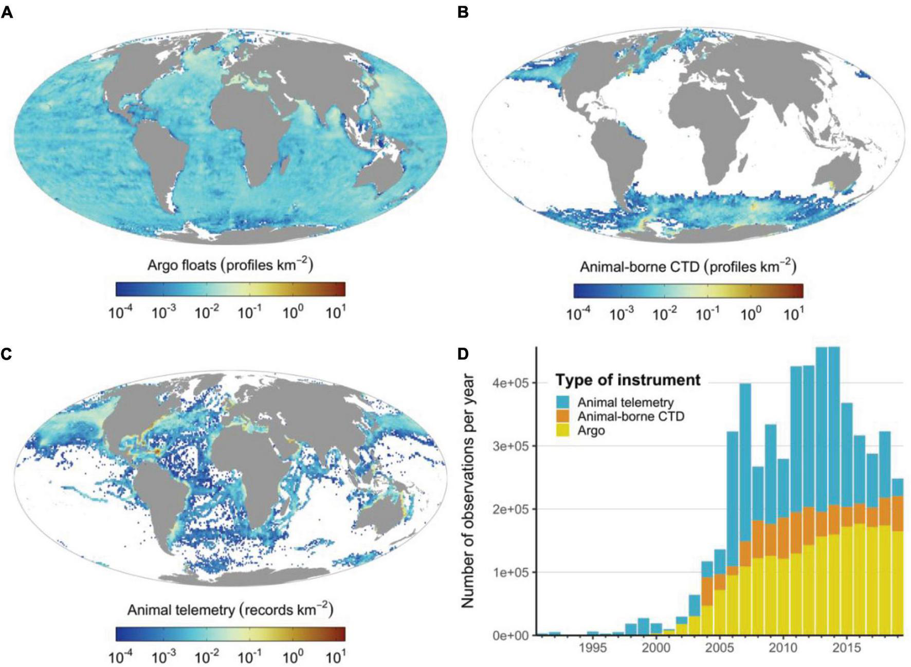 The spatial and temporal distribution of the Argo network and animal-borne sensor observations. (A) Density distribution of Argo profiles, (B) density distribution of CTD casts from animal-borne sensors, (C) density distribution of animal telemetry records (i.e., only location observations), (D) annual number of observations generated by each instrument type. Note that animal-borne CTD data (sourced from the MEOP program) were mainly provided by the polar research community, whereas animal telemetry records from OBIS-SEAMAP (Halpin et al., 2009) highlight the potential of marine animals to cover unsampled regions from temperate and tropical regions. The OBIS-SEAMAP telemetry records were accessed and downloaded on 2nd May 2021.