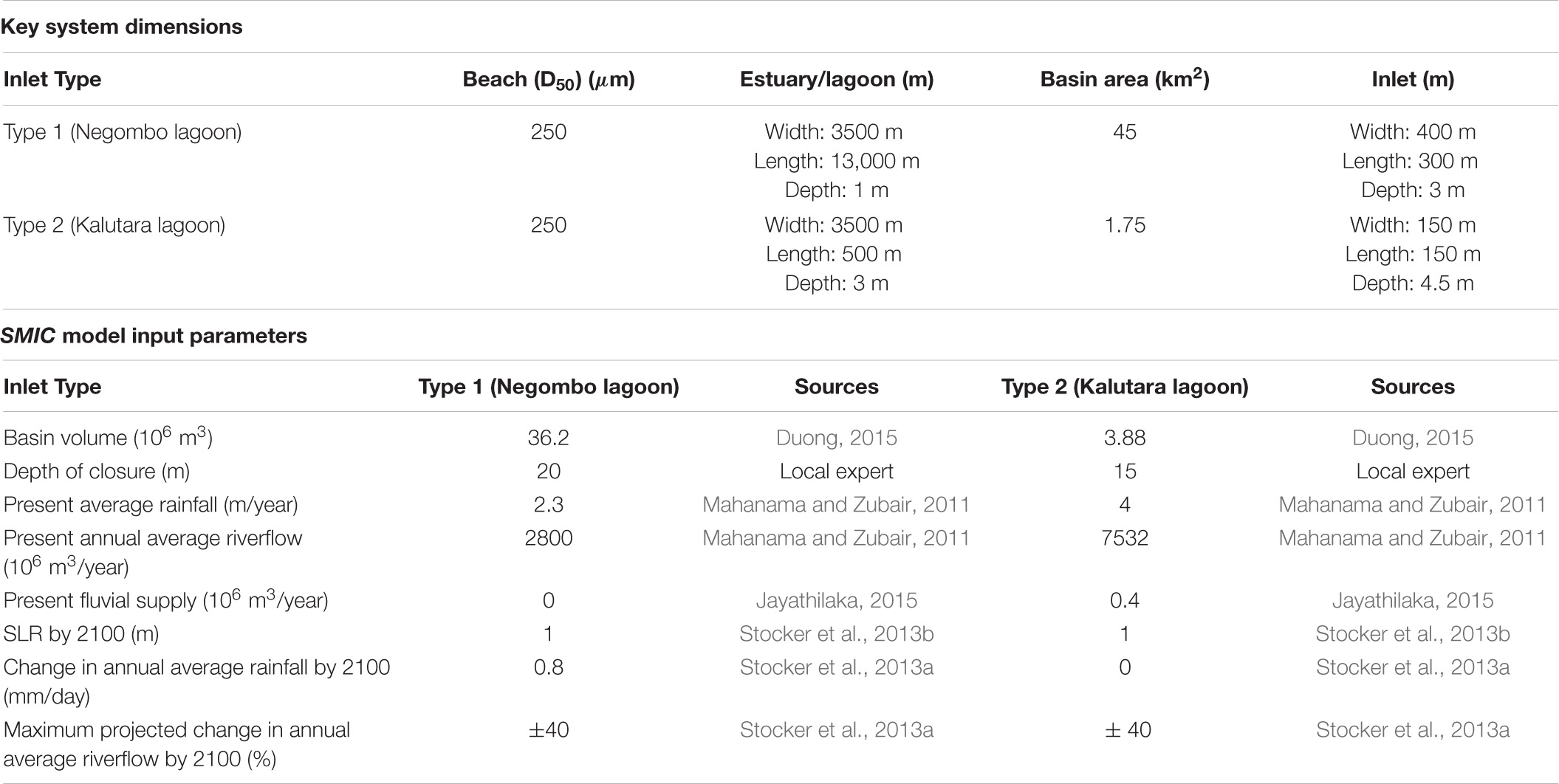 Table 1. Key dimensions of the two systems used to generate the schematised bathymetries and the adopted SMIC model input parameter values and sources.