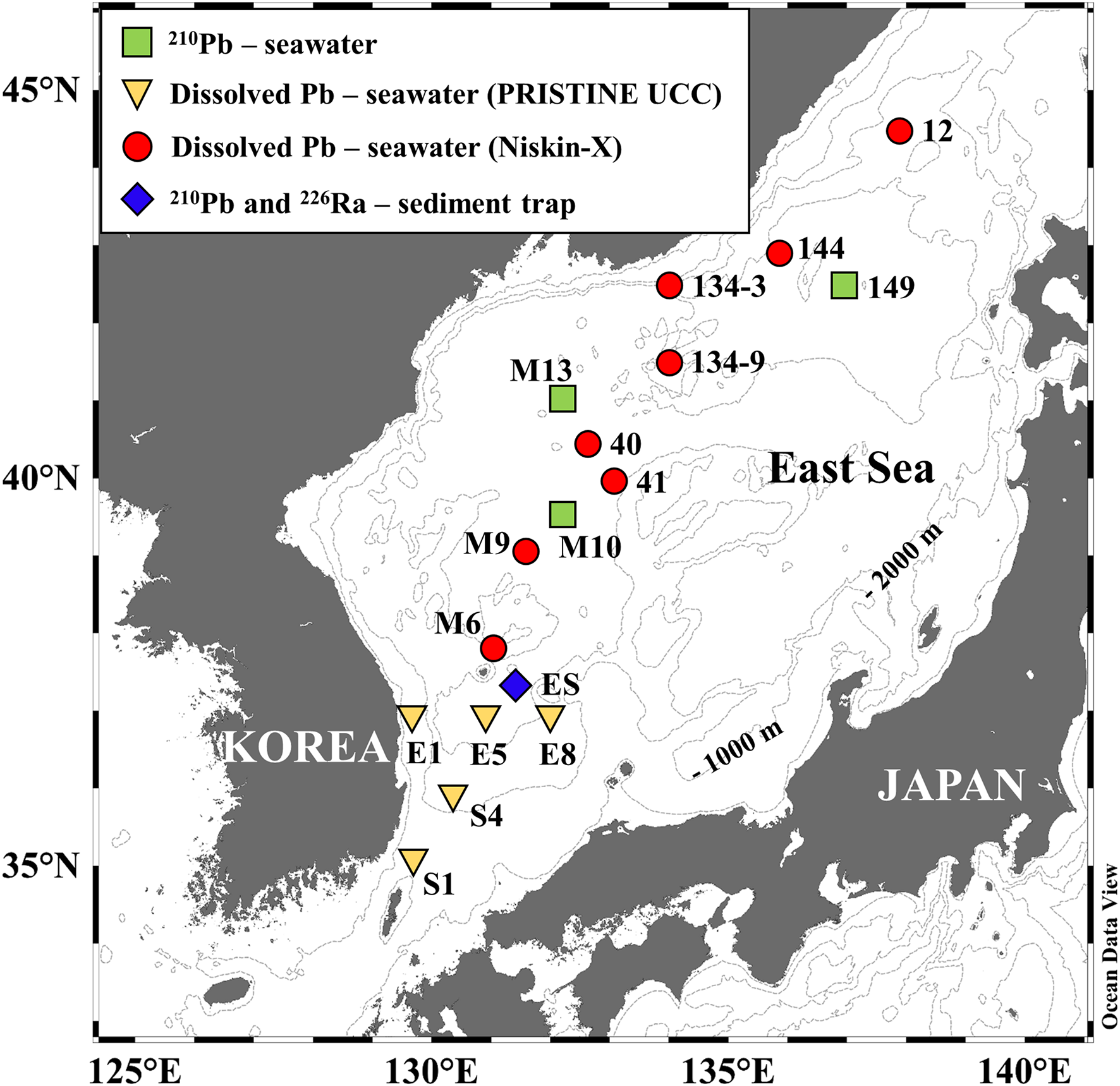 The East Sea (Japan Sea) is an enclosed deep marginal sea in the northwestern Pacific Ocean, with a maximum depth of 3700 m and a surface area of 1.0 × 10 6 km 2. This sea has a deep water formation and a meridional overturning circulation similar to the global ocean (Ichiye, 1984; Gamo, 1999; Kim et al., 2001), although the turnover time of deep water (∼100 years) is shorter than the global circulation time (Watanabe et al., 1991; Tsunogai et al., 1993; Kumamoto et al., 1998). Since the East Sea does not have a large discharge from rivers and is located off the eastern part of the Asian continent, large amounts of lithogenic and anthropogenic elements enter the upper ocean through atmospheric deposition (Park et al., 2006; Jo et al., 2007; Kim et al., 2011; Yan and Kim, 2015; Seo and Kim, 2020). The deep water of the East Sea is almost disconnected from the North Pacific Ocean, except through four shallow sills (<150 m). Thus, the East Sea is an ideal site to study the atmospheric inputs of various elements and their behaviors within a closed system.