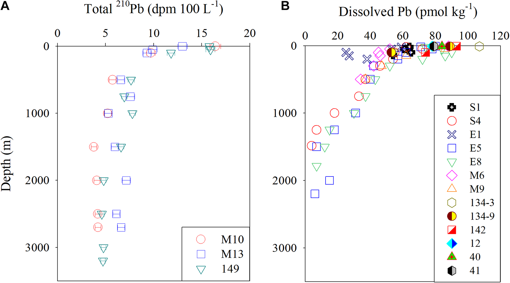Figure 2. Vertical profiles of (A) total 210Pb (dpm 100 L − 1) and (B) dissolved Pb (pmol kg − 1) in the East Sea.