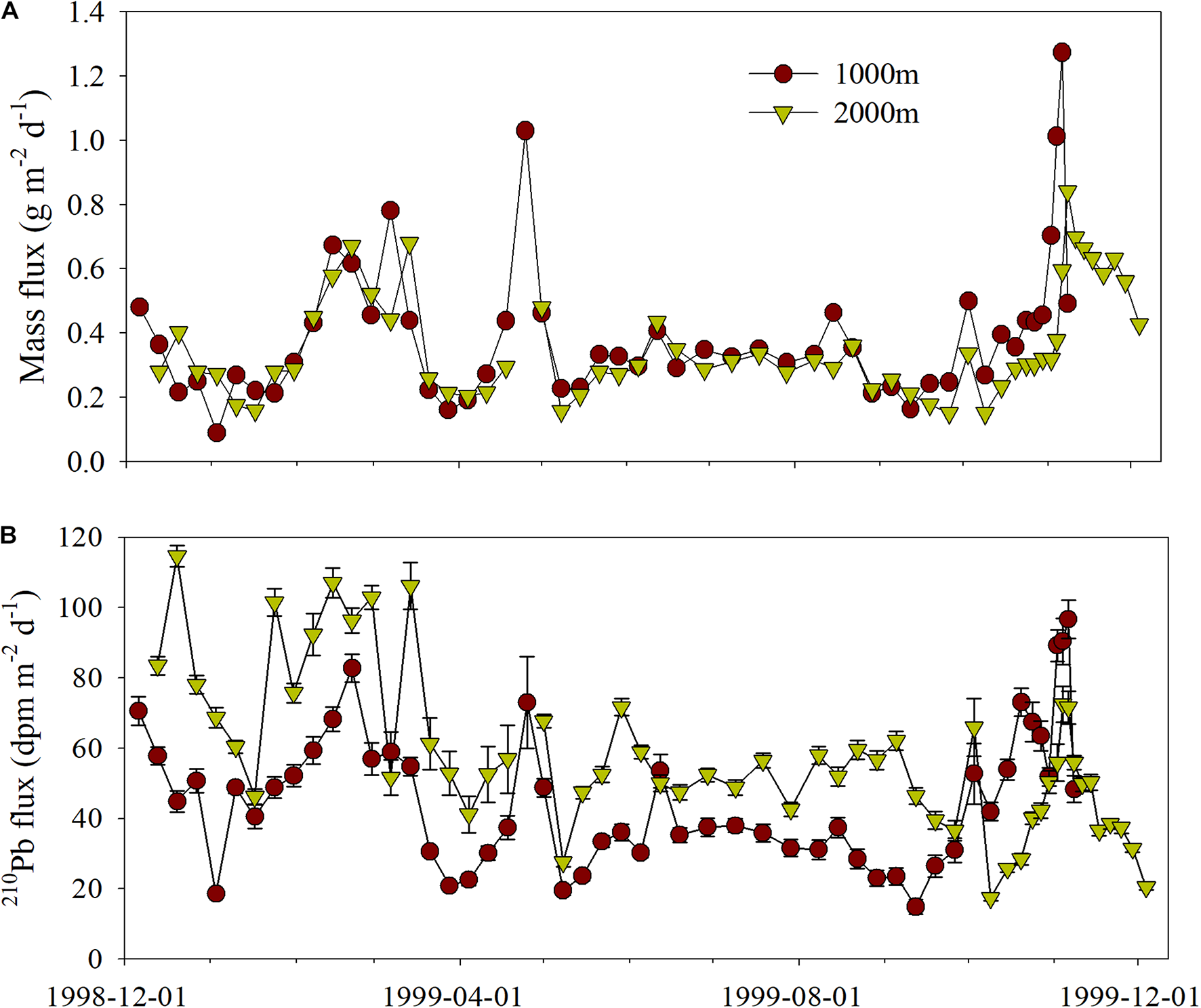 Figure 3. One-year time series data (December 1998 to December 1999) of (A) total particulate flux (g m−2 d−1) and (B) 210Pb (dpm m−2 d−1) flux in the sinking particles.