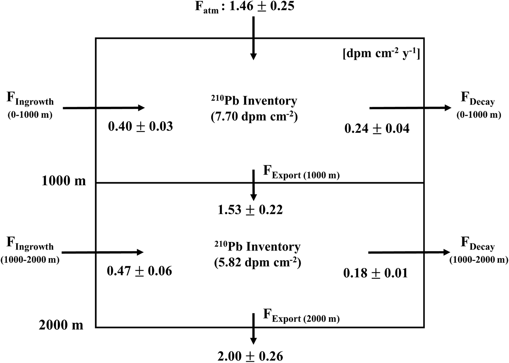 Figure 4. A schematic box model accounting for the ingrowth, decay, export, and atmospheric flux of 210Pb in the East Sea (dpm cm−2 y − 1).