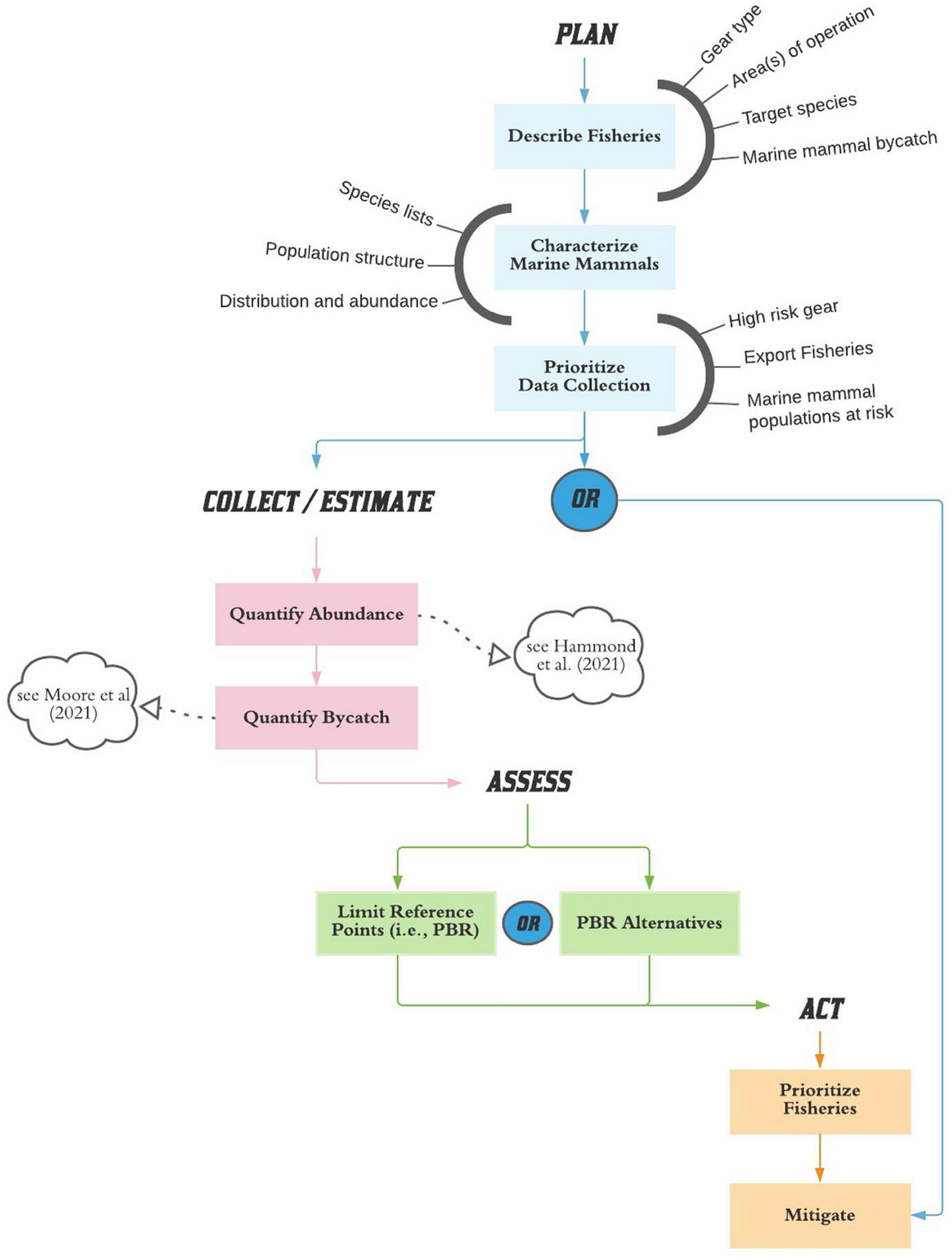 Collectively, we, the authors, have >250 years of contributing to marine mammal assessments, and we attempt to synthesize lessons learned in a way that we hope will be useful to those who are relatively new to managing marine mammal bycatch. We have focused in the Introduction on the rationale for using reference points to evaluate bycatch levels, primarily because using reference points requires the least amount of data compared to other, more complicated assessment methods. However, calculating a reference point is just one, albeit important, part of a larger and more complex process. Considerable information gathering and scientific research must occur before a reference point can be calculated. Then, once a reference point has been calculated and bycatch levels assessed, other steps must occur before bycatch can be reduced. Therefore, we describe and provide guidance on the entire framework, including (1) planning for an assessment of bycatch, (2) collecting appropriate data (e.g., abundance and bycatch estimates), (3) conducting the assessment of bycatch (by calculating a reference point), and (4) using the results of the assessment to guide marine mammal bycatch reduction (Figure 1). Although many of the examples discussed stem from the US approach to addressing marine mammal bycatch, our intention is to provide a general framework for assessing marine mammal bycatch more broadly.