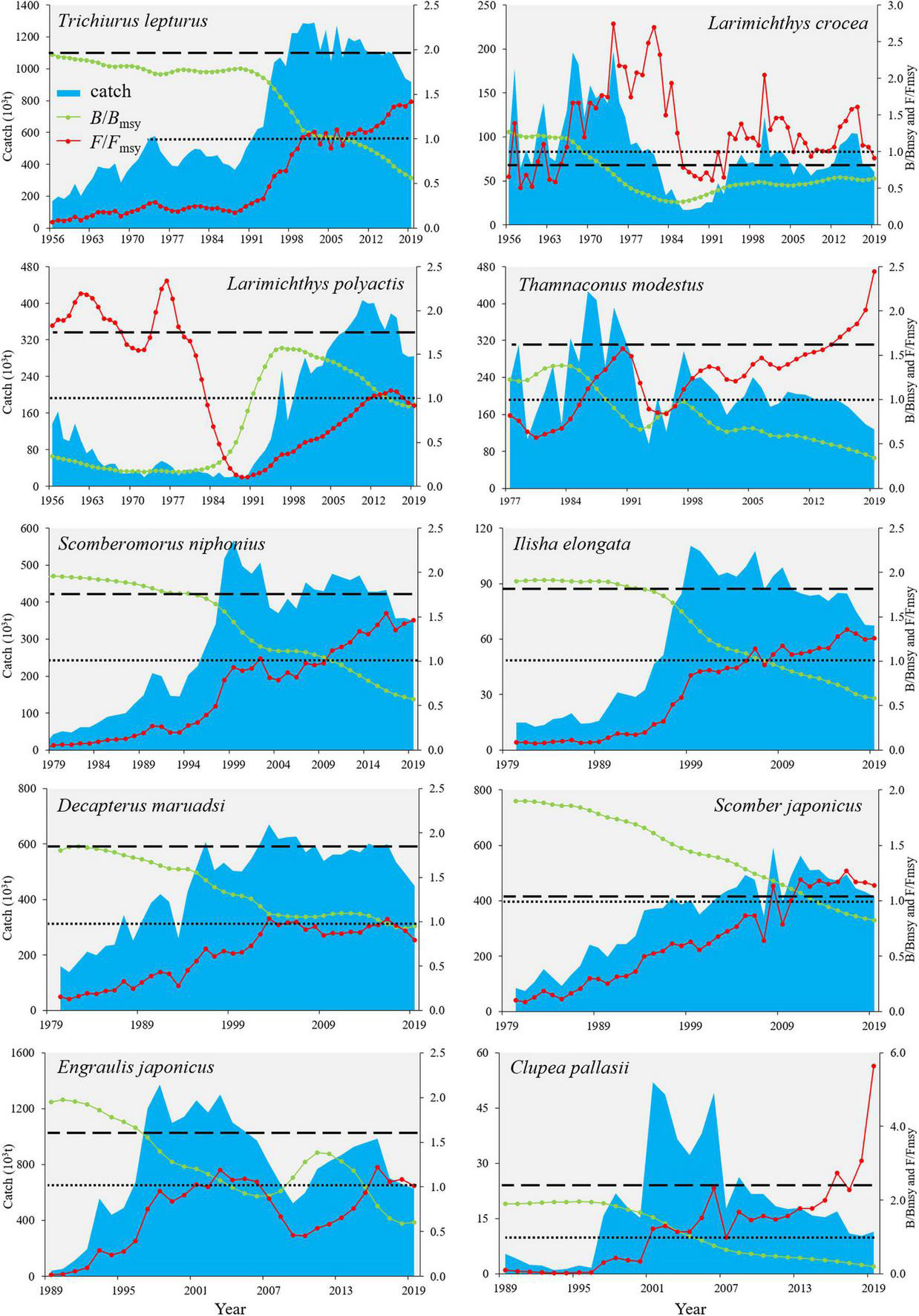 In this study, based on the time-serial catch data extracted from China Fishery Statistical Yearbook, ten coastal economic fish species, accounting for approximate 50% of Chinese total domestic landing catch (Ministry of agriculture of China, 2019), were selected to estimate their historical dynamics using the CMSY model, including T. lepturus, large yellow croaker Larimichthys crocea, small yellow croaker Larimichthys polyactis, black scraper Thamnaconus modestus, Japanese Spanish mackerel Scomberomorus niphonius, Elongate ilisha Ilisha elongate, Japanese scad Decapterus maruadsi, Pacific chub mackerel Scomber japonicus, E. japonicus, and Pacific herring Clupea pallasii. These species included top predators, middle carnivores, omnivores, and plankton feeders, which covered the large benthopelagic, medium benthopelagic, large pelagic, medium pelagic, and small pelagic groups of species. Then, the reference points for management such as MSY, current exploited status (B2019/Bmsy), and remaining level of exploitation (F2019/Fmsy) of these species were modeled. Finally, the fishery rebuilding trajectories under different exploitation scenarios, i.e., fishing mortality equals 0.5, 0.6, 0.8, or 0.95 times mortality capable of producing maximum sustainable yields (0.5 Fmsy, 0.6 Fmsy, 0.8 Fmsy, or 0.95 Fmsy), were projected. We hope this work could help giving recovery opinions to sustainable fishery management.