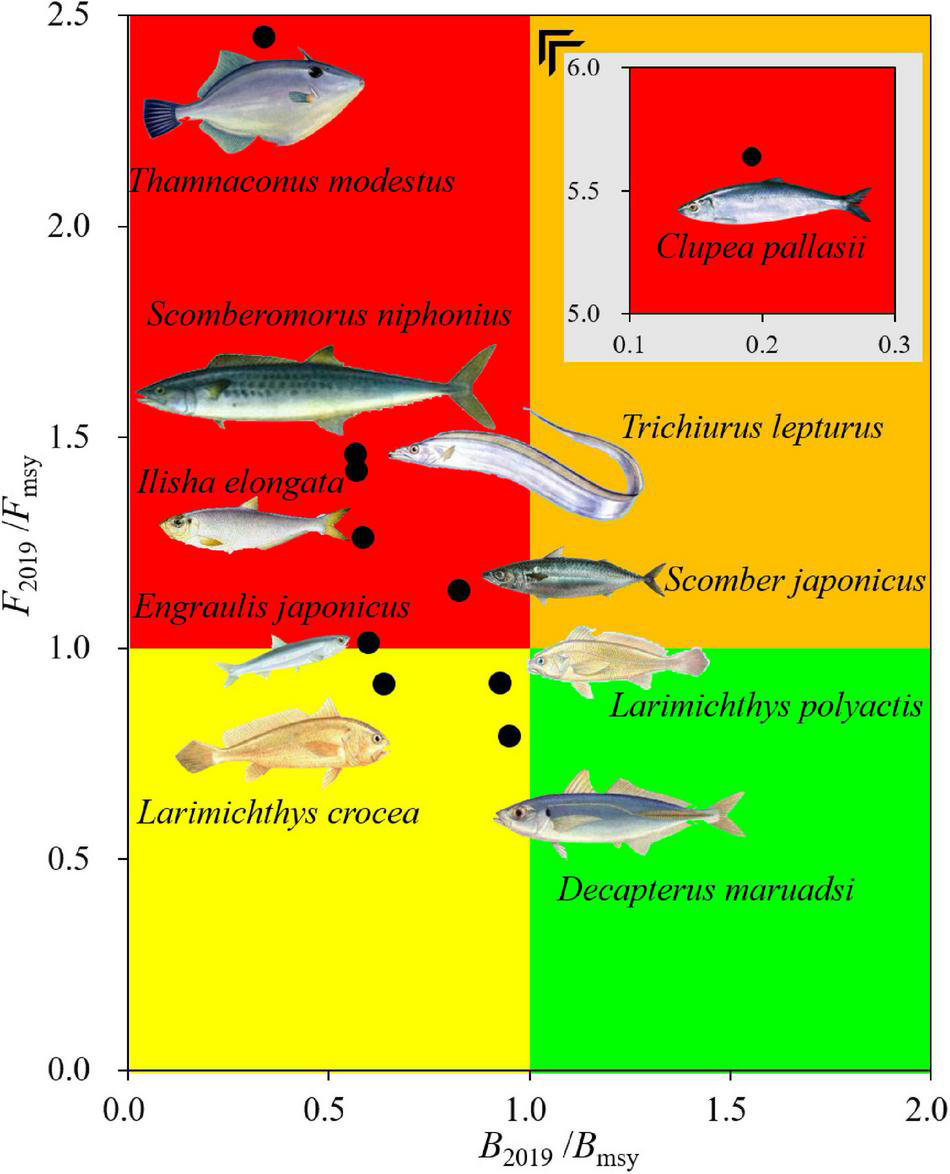 The maximum intrinsic rate of population increase (r) ranged from 0.24 of L. crocea to 1.29 of E. japonicus. Environmental carrying capacity (k) ranged from 203 × 103 metric tons of C. pallasii to 5,151 × 103 metric tons of T. lepturus. All species had fewer catches in 2019 than MSY (Table 2). Clupea pallasii had the lowest B2019/Bmsy (0.19) value, while D. maruadsi had the highest (0.95). The F2019/Fmsy ranged from 0.79 of D. maruadsi to 5.64 of C. pallasii, with the fishing mortalities for seven species of the ten were higher than Fmsy. The Kobe plot (Figure 2) based on the relationship between current exploited status (B2019/Bmsy), and the remaining level of exploitation (F2019/Fmsy) showed that seven fish species, i.e., T. lepturus, T. modestus, S. niphonius, I. elongata, S. japonicus, E. japonicus, and C. pallasii, were in the red area (B2019 < Bmsy and F2019 > Fmsy), indicating overexploited stocks that were suffering overfishing. C. pallasii was in the worst condition, followed by T. modestus. D. maruadsi, L. crocea, and L. polyactis were in the yellow area, indicating the recovering of overexploited stocks from reduced fishing pressure (Figure 2).
