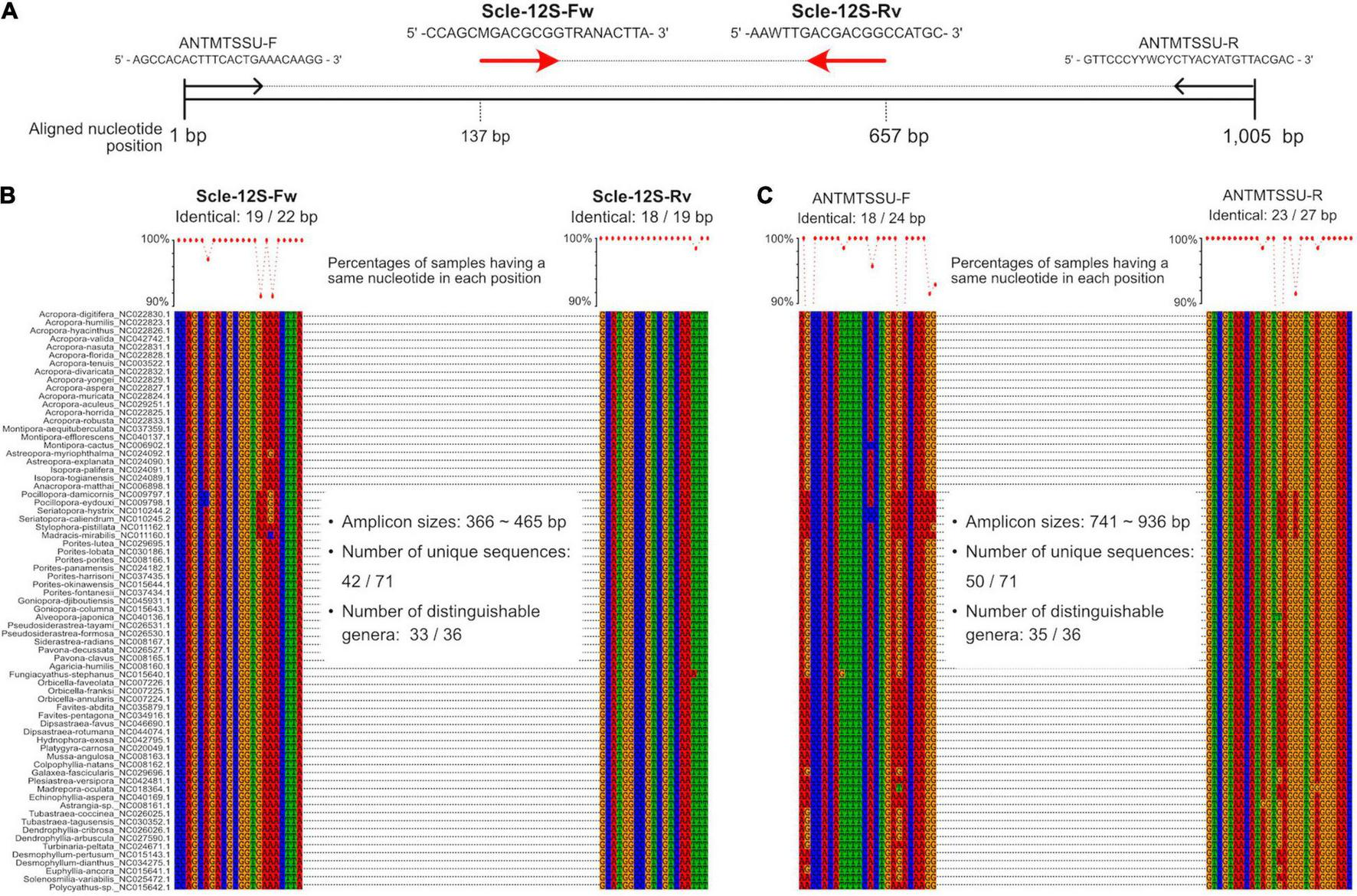 Development of universal primer pairs, Scle-12S-Fw and Scle-12S-Rv, to amplify scleractinian 12S rRNA genes. (A) Schematic representation of primer sequences, positions of primer binding sites in aligned 12S rRNA genes, and comparisons with previously reported universal primers (ANTMTSSU-F and ANTMTSSU-R) (Chen and Yu, 2000). Positions of the designed primers (Scle-12S-Fw and Scle-12S-Rv) are shown with red arrows. (B) Nucleotide sequence alignments of expected Scle-12S-Fw and Scle-12S-Rv primer binding sites among the 71 scleractinian mt genomes. (C) Nucleotide sequence alignments of expected ANTMTSSU-F and ANTMTSSU-R primer binding sites among the 71 scleractinian mt genomes. Numbers of identical nucleotides in primer binding sites among the 71 scleractinians are shown, and percentages of samples having the same nucleotide in each primer position are shown in a line graph (more than 90% are shown as dots).