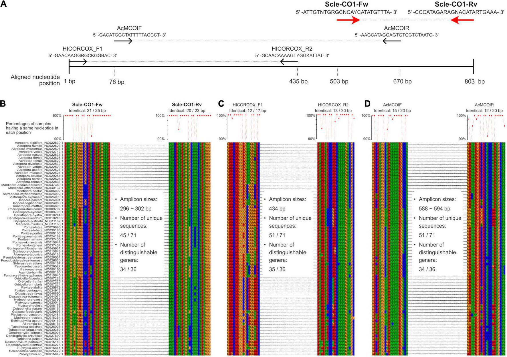 Development of universal primer pairs, Scle-CO1-Fw and Scle-CO1-Rv, to amplify scleractinian cytochrome c oxidase subunit I genes (CO1). (A) Schematic representation of primer sequences, positions of primer binding sites in aligned CO1 genes, and comparisons with previously reported universal primers (AcMCOIF and AcMCOIR) (Fukami et al., 2008) and metabarcoding primers (HICORCOX_F1 and HICORCOX_R2) (Nichols and Marko, 2019). Positions of the designed primers (Scle-CO1-Fw and Scle-CO1-Rv) are shown with red arrows. (B) Nucleotide sequence alignments of expected Scle-CO1-Fw and Scle-CO1-Rv primer binding sites among the 71 scleractinian mt genomes. (C) Nucleotide sequence alignments of expected HICORCOX_F1 and HICORCOX_R2 primer binding sites among the 71 scleractinian mt genomes. (D) Nucleotide sequence alignments of expected AcMCOIF and AcMCOIR primer binding sites among the 71 scleractinian mt genomes. Numbers of identical nucleotides in primer binding sites among the 71 scleractinians are shown, and percentages of samples having the same nucleotide in each primer position are shown in a line graph (more than 90% are shown as dots).