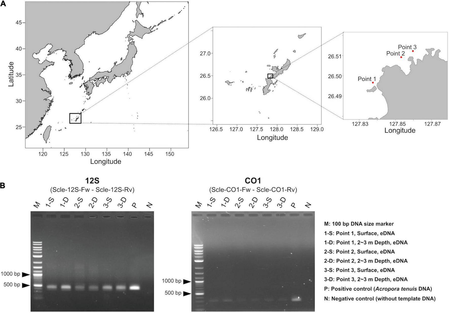 Water sampling and PCR amplification of extracted eDNA. (A) Maps showing three sampling locations (red dots). Shapefiles were downloaded from Nature Earth (https://www.naturalearthdata.com/) and Global Administrative Areas (https://gadm.org), and were visualized as maps using maptools in R, version 4.1.0. Exact sampling locations, sampling times, and distances between sampling locations are available in Supplementary Table 2. (B) PCR amplification of eDNA using the designed primers for 12S (left) and CO1 (right).
