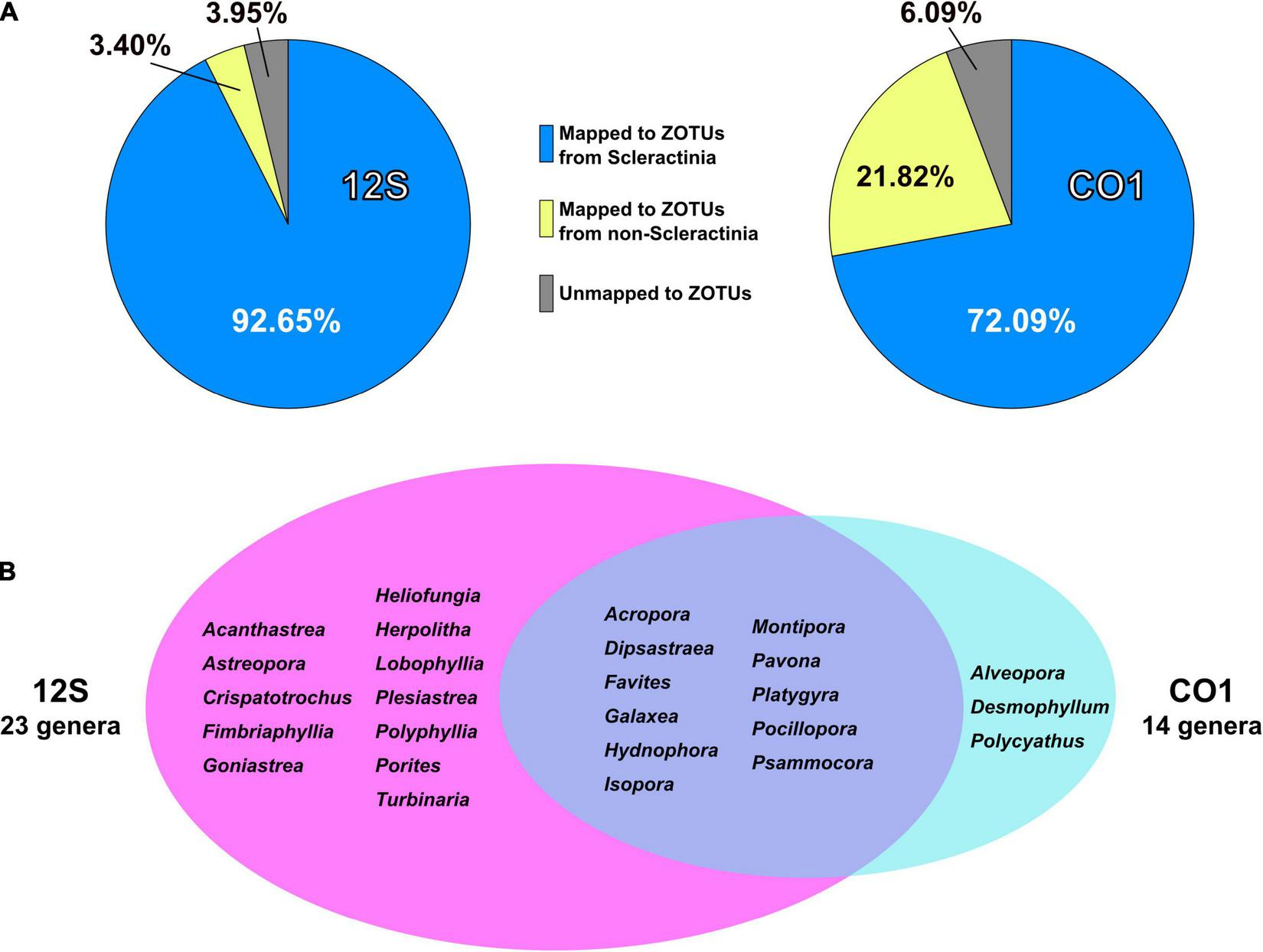 PCR amplicon sequencing and detection of coral genera from eDNA. (A) Percentages of reads mapped to ZOTUs from Scleractinia, ZOTUs from non-Scleractinia, and none of the ZOTUs. Values are averages of six eDNA samples, and are available in Supplementary Tables 4, 5. (B) Numbers of coral genera detected from 12S and CO1 PCR amplicons using eDNA and comparisons of genera identified by the two primer sets. Coral genera with more than 0.1% of all mapped reads in each sample are included.