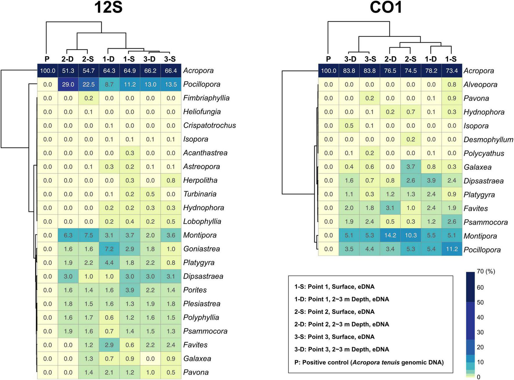 Percentages of sequencing reads mapped to coral genera in each eDNA sample. 12S PCR amplicons are shown to the left and CO1 to the right. Percentages are colored in the heatmap. Each sample and coral genera were hierarchically clustered using the ward D method. Percentages for each coral genus are shown in each box, and numbers of mapped reads are available in Supplementary Tables 7, 8.