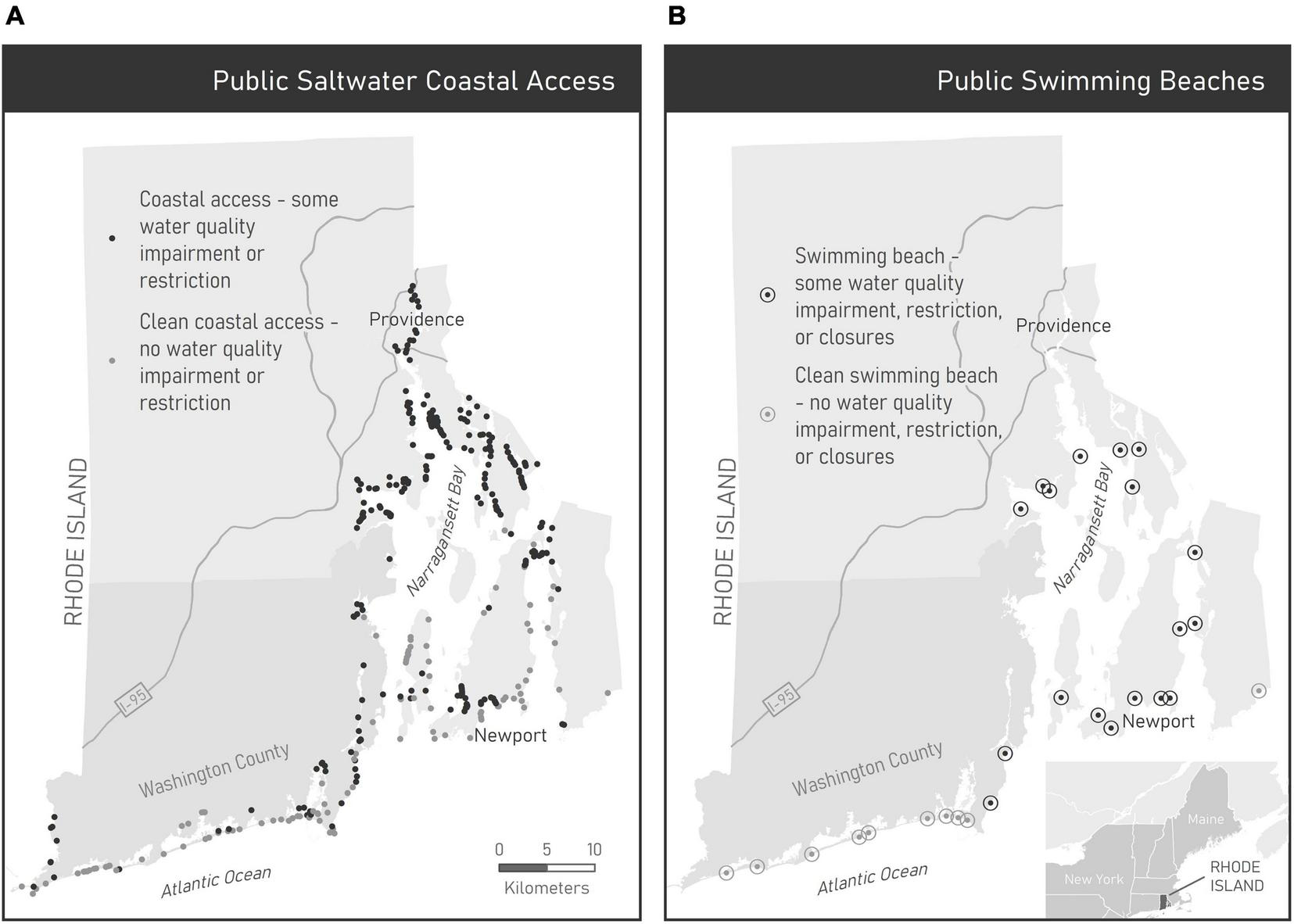 Rhode Island is nicknamed “The Ocean State” for its roughly 1300 km of saltwater shoreline (Figures 1A,B). In addition to an expanse of shoreline abutting the Atlantic Ocean, the state’s coastal geography is dominated by New England’s largest estuary, Narragansett Bay, and a set of coastal salt ponds. The saltwater coastline in Narragansett Bay extends in a variety of embayments in densely settled coastal areas and highly urbanized areas surrounding Providence, the state capital and primary population center located in the upper estuary. Water quality declines from the tidally flushed areas in the south to the terrestrially influenced upper saltwater reaches of Narragansett Bay (Narragansett Bay Estuary Program, 2017). Because of Rhode Island’s small size (roughly 65 by 80 km), all residents live relatively close to the coast and thus should have access to coastal recreation.
