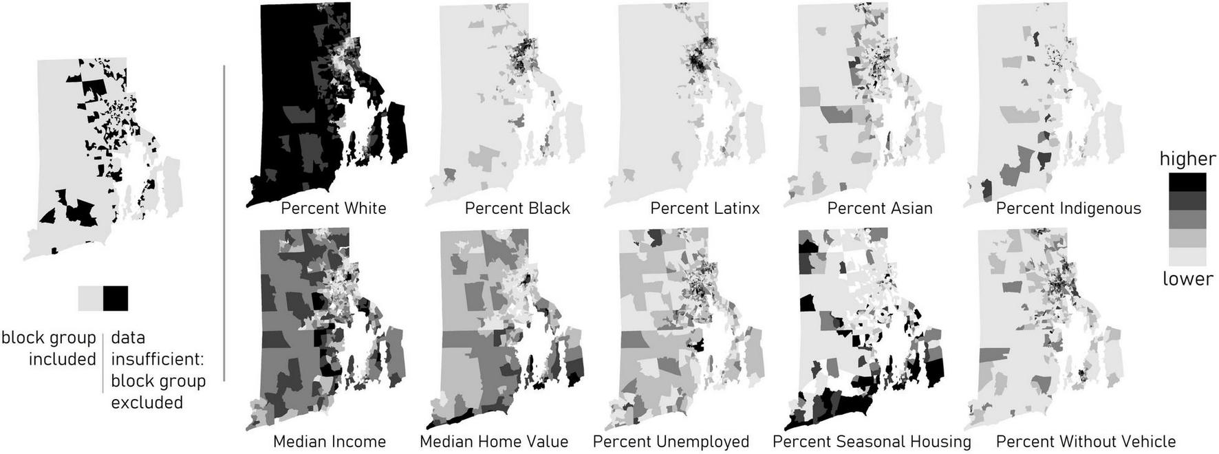 On the left, 206 census block groups (in black) were excluded from the regression analyses due to insufficient data for some of the demographic variables. On the right, choropleth maps of demographic variables, symbolized using five-class natural breaks to optimize the uniformity of values in each class [U.S. Census American Community Survey (ACS) 5-Year Data Profiles, 2012–2016]. Darker shades indicate higher values.