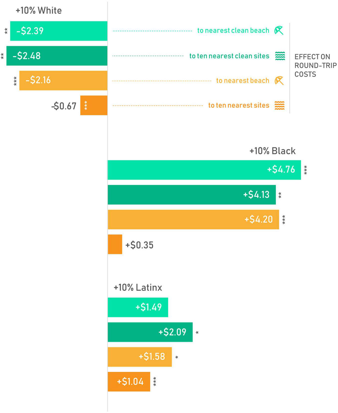 Finally, variation in round-trip costs were tabulated from the regression results to create policy-oriented metrics. The aim was to illustrate, more intuitively, the associations between race and ethnicity and travel distance from any census block group to the nearest and cleanest public coastal access sites. The additional distance represents a financial cost in terms of time and the associated costs of transport. Costs were calculated from the travel distance coefficients associated with the race and ethnicity variables (for illustrative purposes, marginal changes were based on a change of ten percent of the white, Black, or Latinx population for any given block group). These costs reflect the differences in the cost of gasoline and wear and tear for a round trip and the value of the amount of time spent traveling as it relates to the proportions of any race/ethnicity group for a given block group (Equation 1).