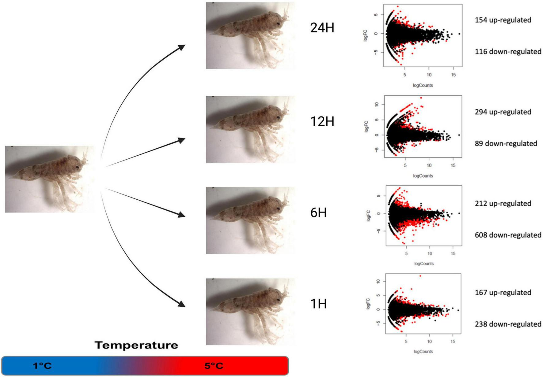A laboratory-controlled heat stress kinetic was performed using 36 juveniles of G. antarcticus individuals exposed to 5°C temperature, whereas 18 individuals were maintained at summer normal temperature 0°C (Control). Nine heat-stressed organisms were sampled at 1, 6, 12, and 24 h to form three pools of three individuals, at each kinetic point, prior to RNA isolation. Equally, nine non-stressed organisms were sampled at 1 and 24 h to constitute three pools of three individuals at each point for RNA isolation of control conditions. No fatalities were observed during the thermal exposure.