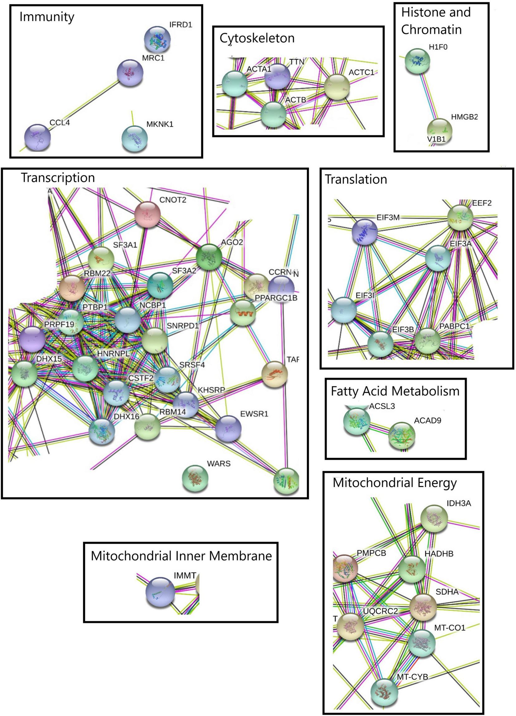 Protein-protein interaction network performed with STRING online software using four kinetic points for up-regulated transcripts. The relevant molecular pathways were zoomed and placed in squares indicating cluster of transcript representations of each pathway. Please see Supplementary Material 3 and Supplementary Figure 6 for a complete view of protein-protein interaction network.