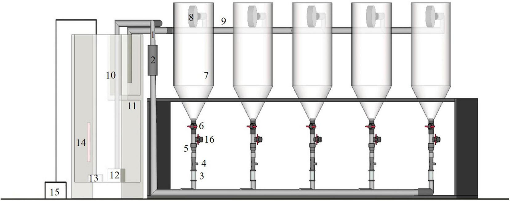 Experimental RAS configuration: (1) inlet pipe; (2) ultraviolet disinfection lamp; (3) flow meter; (4) venturis; (5) one-way valves; (6) valves; (7) transparent cone container; (8) filter drums; (9) drain pipe; (10) filter tank; (11) filter partition; (12) water pump; (13) aeration disk; (14) thermostat; (15) air pump; (16) outfall.