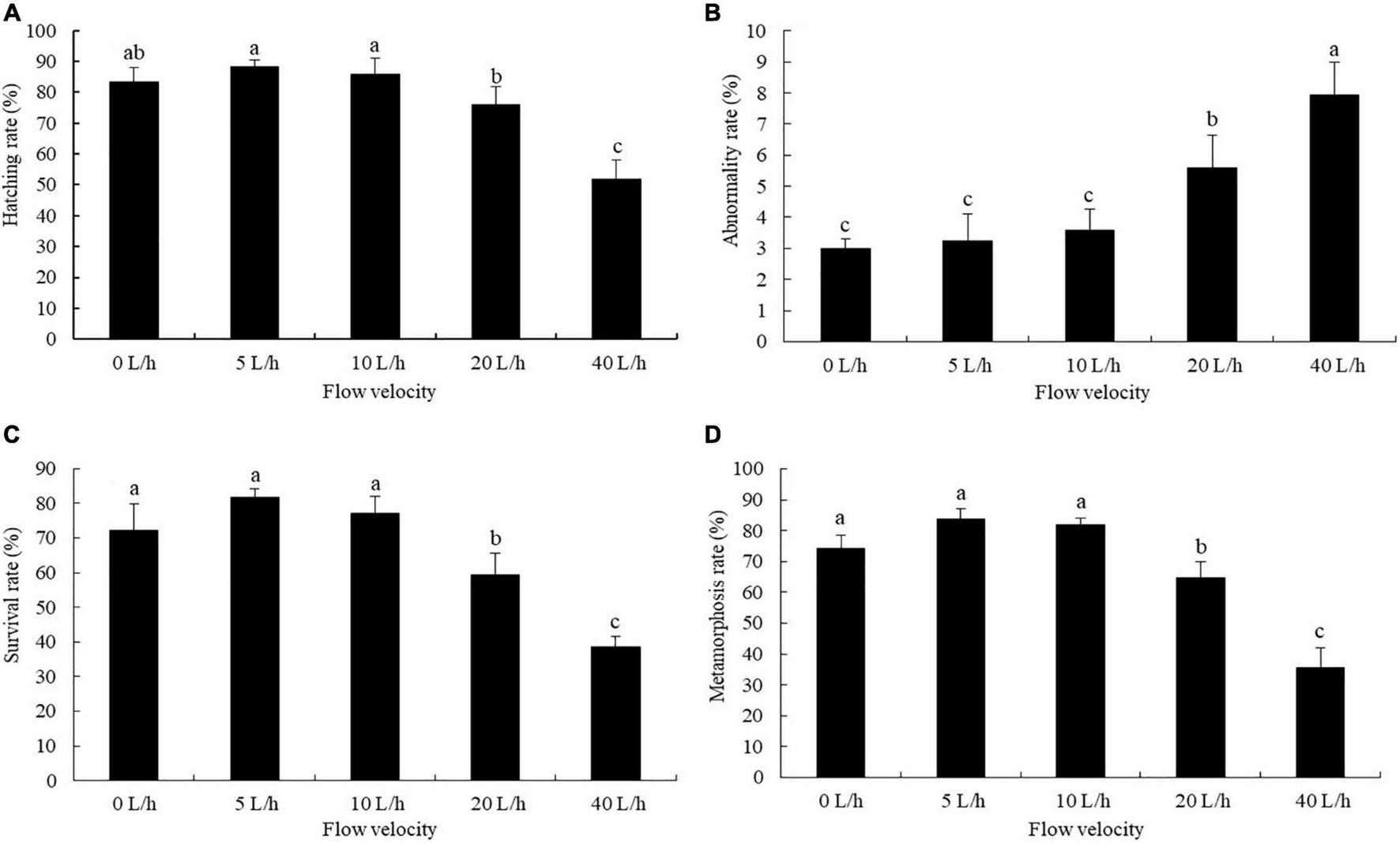 Velocity had significant effects on the larval survival and metamorphosis rates. When the flow velocity increased to 40 L/h, the larval survival rate and metamorphosis rate were significantly lower than in the 0, 5 and 10 L/h groups (Figures 2C,D, P < 0.05). Even though no significant difference was identified in the larval survival rate and metamorphosis rate between the 0, 5 and 10 L/h groups, each was significantly higher than that in the 20 L/h group (P < 0.05).