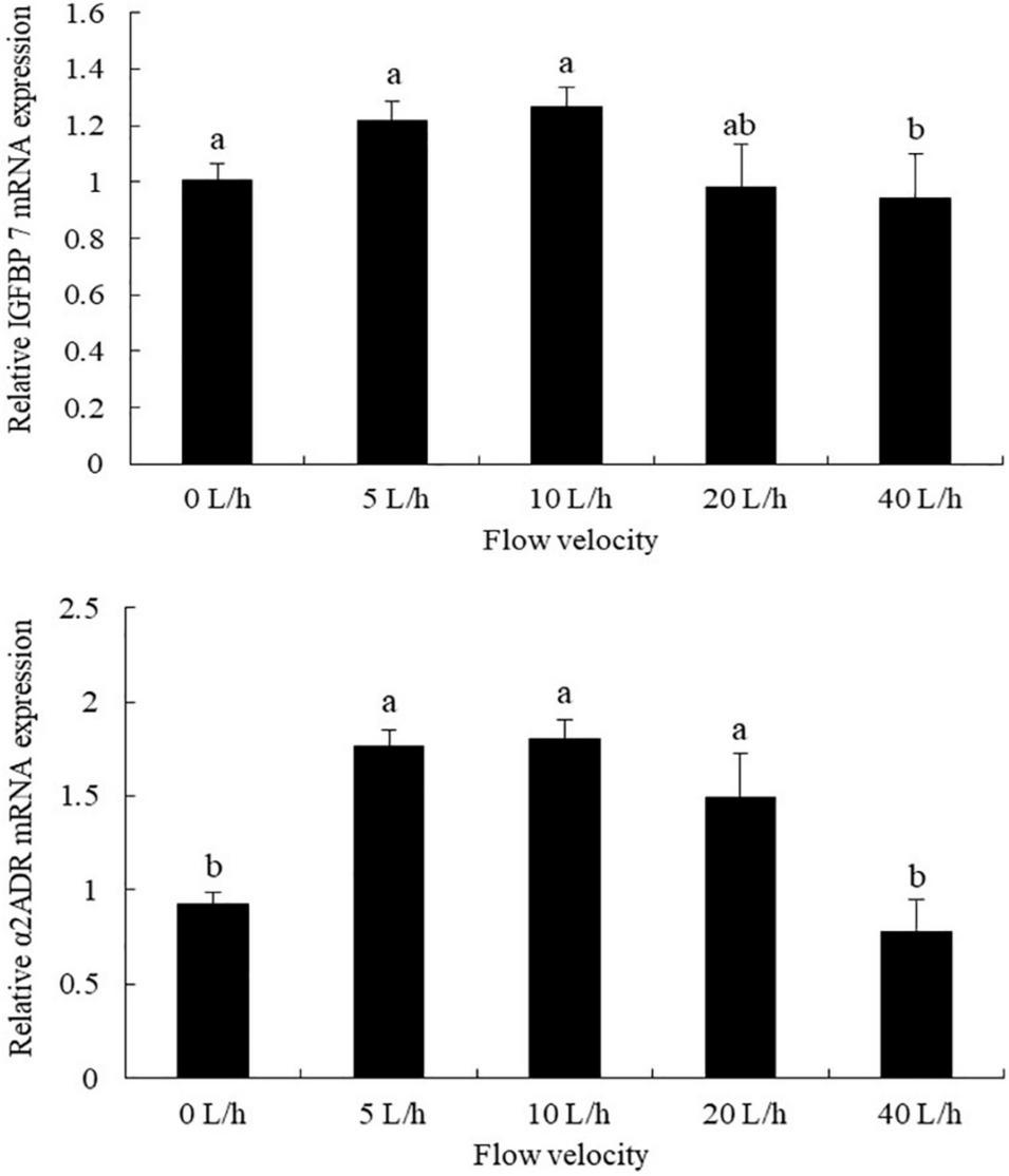 Data are represented as mean ± SD (n = 4). Different superscripted lowercase letters within the same column indicate significant differences between flow velocities (P < 0.05).