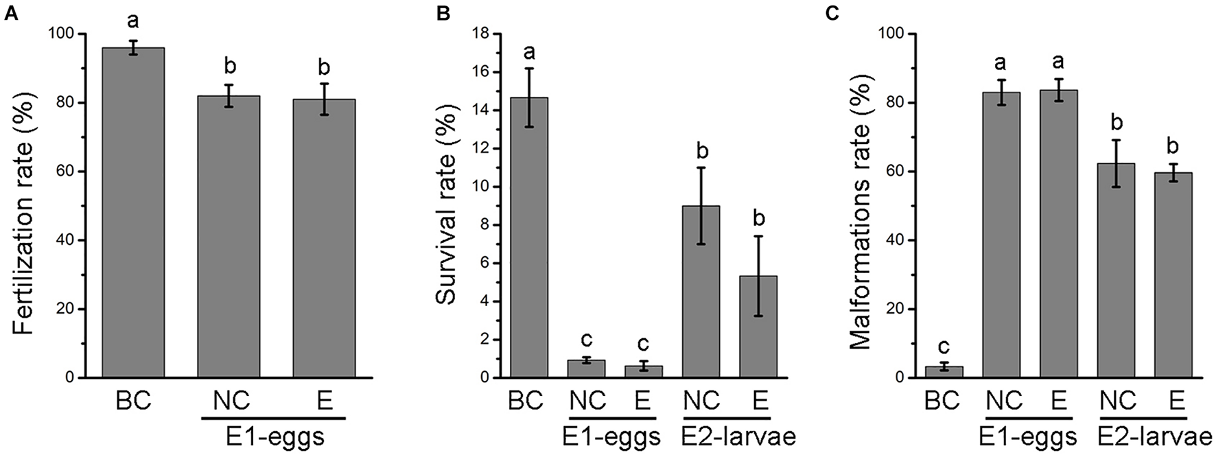 Fertilization rate (A), survival rate (B) and malformations rate (C) of oyster larvae after electroporation. BC, black control; NC, negative control; E, electroporation group. Error bars represent means ± SD of three independent repeats. One-way ANOVA were used for significance analysis (P < 0.05).