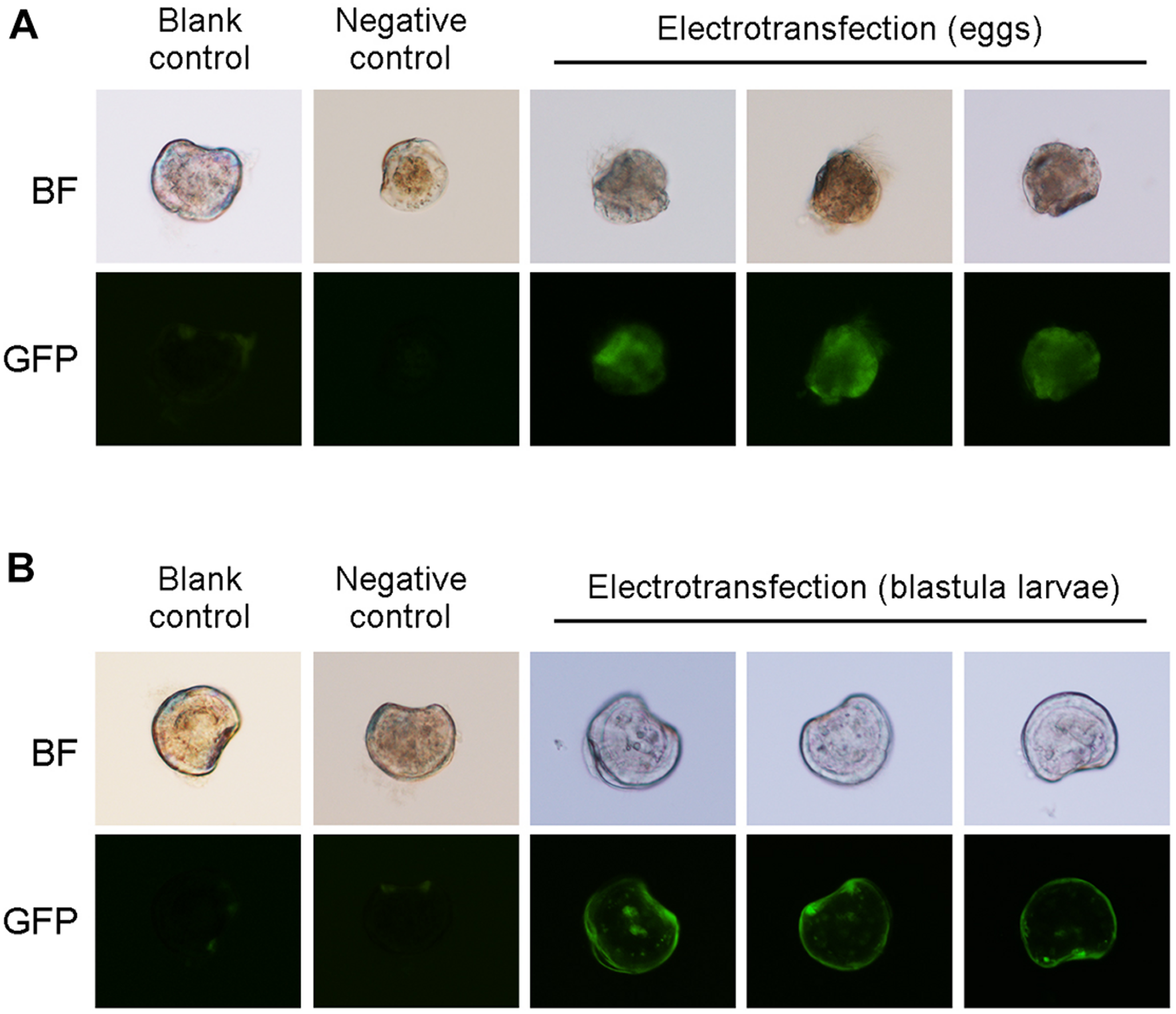 Fertilization rates were calculated 1 h after the addition of sperm. As shown in Figure 2A, 81 and 82% of eggs were fertilized successfully after electroporation with and without plasmid, respectively. Meanwhile, 96% of zygotes were cleaved in the blank control group. Most of the larvae that developed from the electroporated eggs died 24 h later. Thus, the survival rate was calculated 24 h after fertilization and 15% of the larvae in the blank control group were alive, while only 0.6 and 1% living larvae were observed in the electroporation with and without vector, respectively (Figure 2B). Moreover, a high malformation rate was evidenced after electroporation, with more than 80% of larvae not developing into normal D-larvae (Figure 2C). When electroporation was performed on blastula larvae, the survival rates of the transfected larvae were reduced to 5 and 9% (Figure 2B), and the malformation rate was reduced to 60 and 62% after transfection with or without plasmid (Figure 2C). These results suggest that electroporation severely affects larval development, thus, causing high mortality and malformation rates.