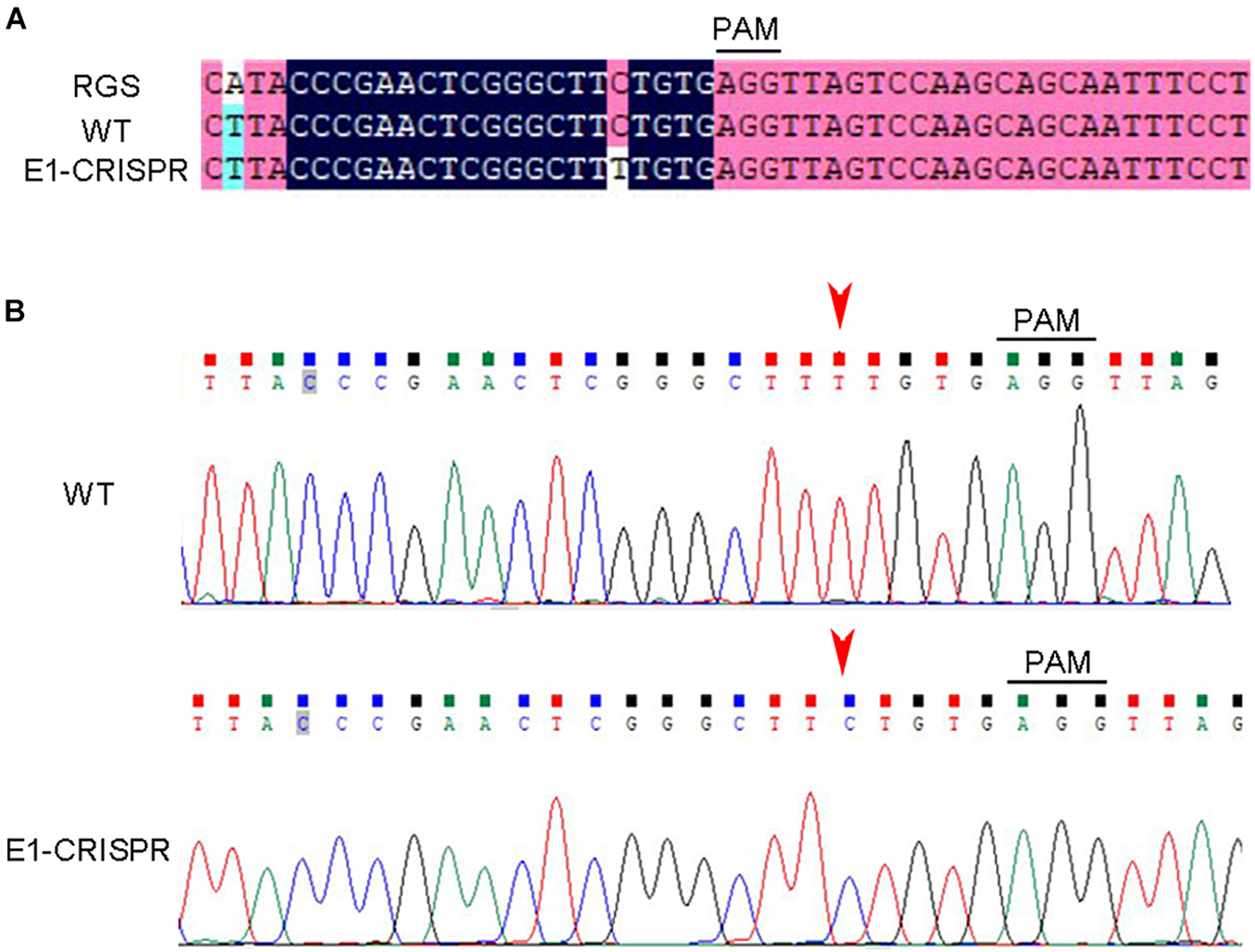 CRISPR/Cas9-mediated mutations in oyster D-larvae delivered by electroporation. (A) Comparison of sequencing results between wild type and edited larvae. (B) Sequencing traces of the target region of CaPitx. The PAM sequence is underlined by the black bar. The red arrow indicates the mutation site. PAM, protospacer adjacent motif. RGS, reference genome sequence. WT, wild-type. “E1-CRISPR” represent D-larvae developed from an electroporated egg.