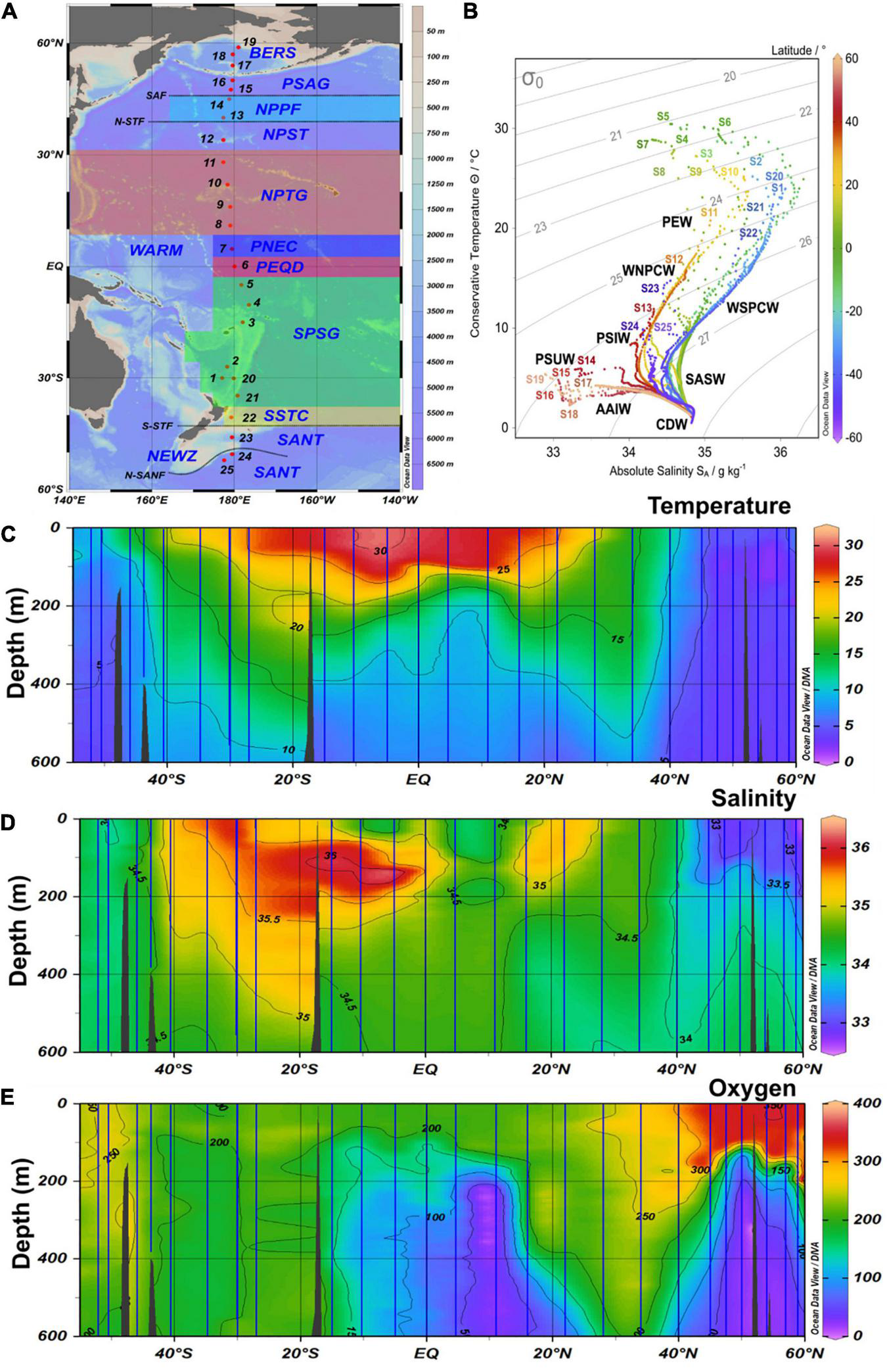 (A) Map with biogeographic provinces, track and station numbers of cruises SO248 (station 1–19) and SO254 (station 20–25) with RV Sonne along a transect across the Pacific Ocean. BERS, Bering Sea; PSAG, Pacific subarctic gyre; NPPF, north Pacific polar frontal region; NPST, north Pacific subtropical gyre; NPTG, north Pacific tropical gyre; PNEQ, Pacific north equatorial counter current; PEQD, Pacific equatorial divergence; SPSG, south Pacific subtropical gyre; SSTC, south subtropical convergence; SANT, subantarctic province. (B) T-S graph of all stations with data throughout the water column and identified water masses. SASW, Subantarctic surface water; AAIW, Antarctic intermediate water; PEW, Pacific equatorial water; CDW, Circumpolar deep water; PSUW, Pacific subarctic upper water; PSIW, Pacific intermediate water. (C–E) Contour graph of potential temperature, salinity and oxygen along the transect in the upper 600 m. Vertical blue lines indicate the continuous CTD-measurements at the stations.