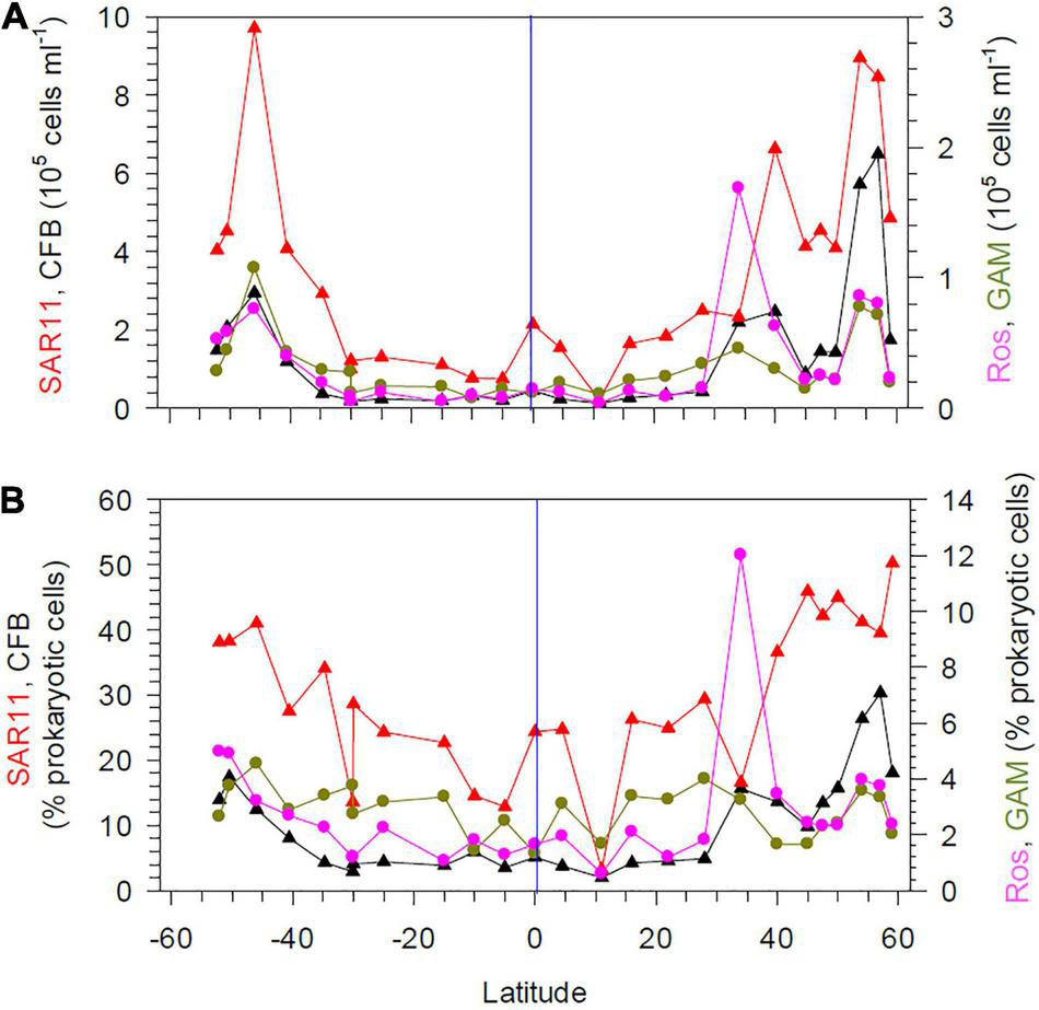 Numbers (A) and proportions (B) of SAR11, Cytophaga/Flavobacteria (CF), the Roseobacter group and Gammaproteobacteria assessed by CARD-FISH at 20 m depth between 52°S and 59°N in the Pacific Ocean during cruises SO248 and SO254. The blue vertical lines mark the equator.
