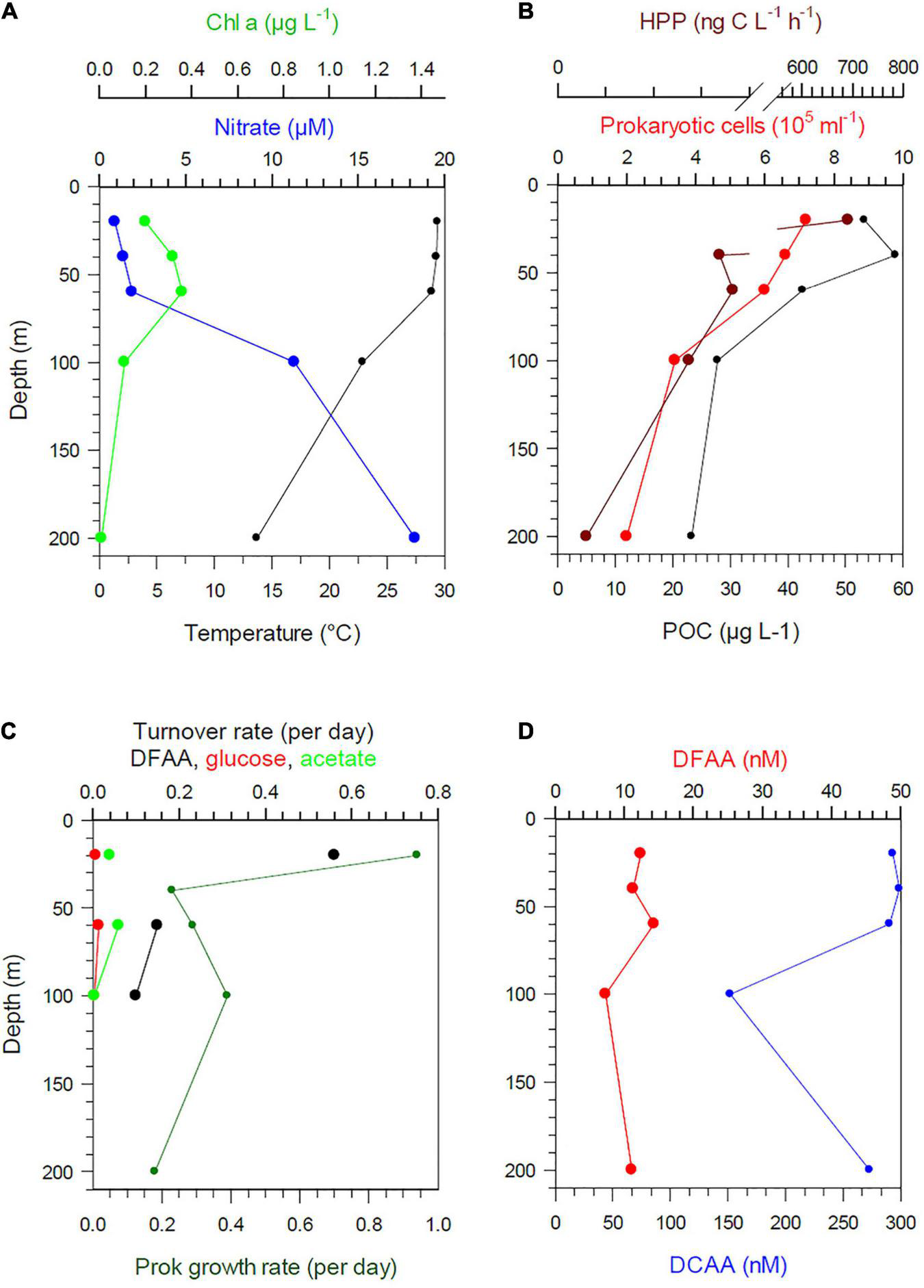 Depth profiles between 20 and 200 m of temperature, nitrate, Chl a(A), POC, prokaryotic cell numbers and HPP (B), Turnover rate constants of DFAA, glucose and acetate and growth rates (C) and concentrations of DFAA and DCAA (D) at station 6 in the PEQD.
