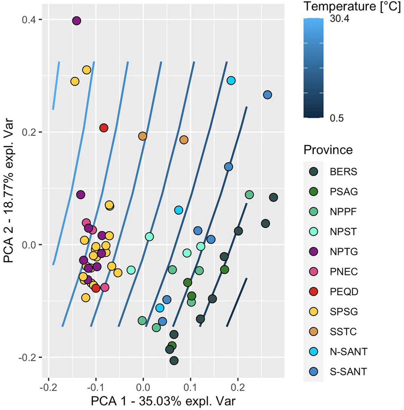 PCA of variables assessed along a transect between 52°S and 59°N at 25 stations and in 10 biogeographic provinces in the upper 100 m and including the depth of the DCM when below 100 m of the Pacific Ocean during cruises SO248 and SO254. Each circle represents the data of one depth (20, 40, 60, 100 m, DCM) at a single station. The color code refers to the affiliated biogeographic provinces. Blue lines indicate the interpolated temperature gradient between 7° and 29°C along the transect. For abbreviations see legend of Figure 1.