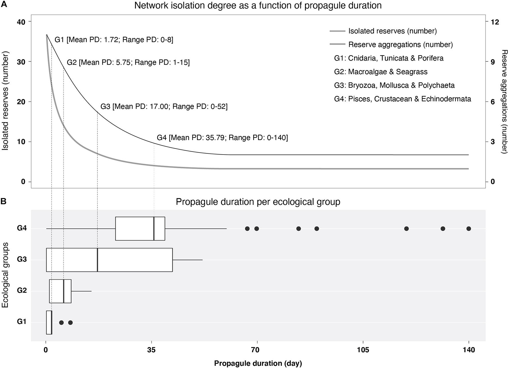 (A) Number of isolated Marine Protected Areas (MPAs) (thin line) and MPA aggregations (i.e., number of clusters; thick line) as a function of propagule duration (PD). (B) Distribution of PD per ecological group. Vertical lines in boxplots depict the mean PD for each ecological group.