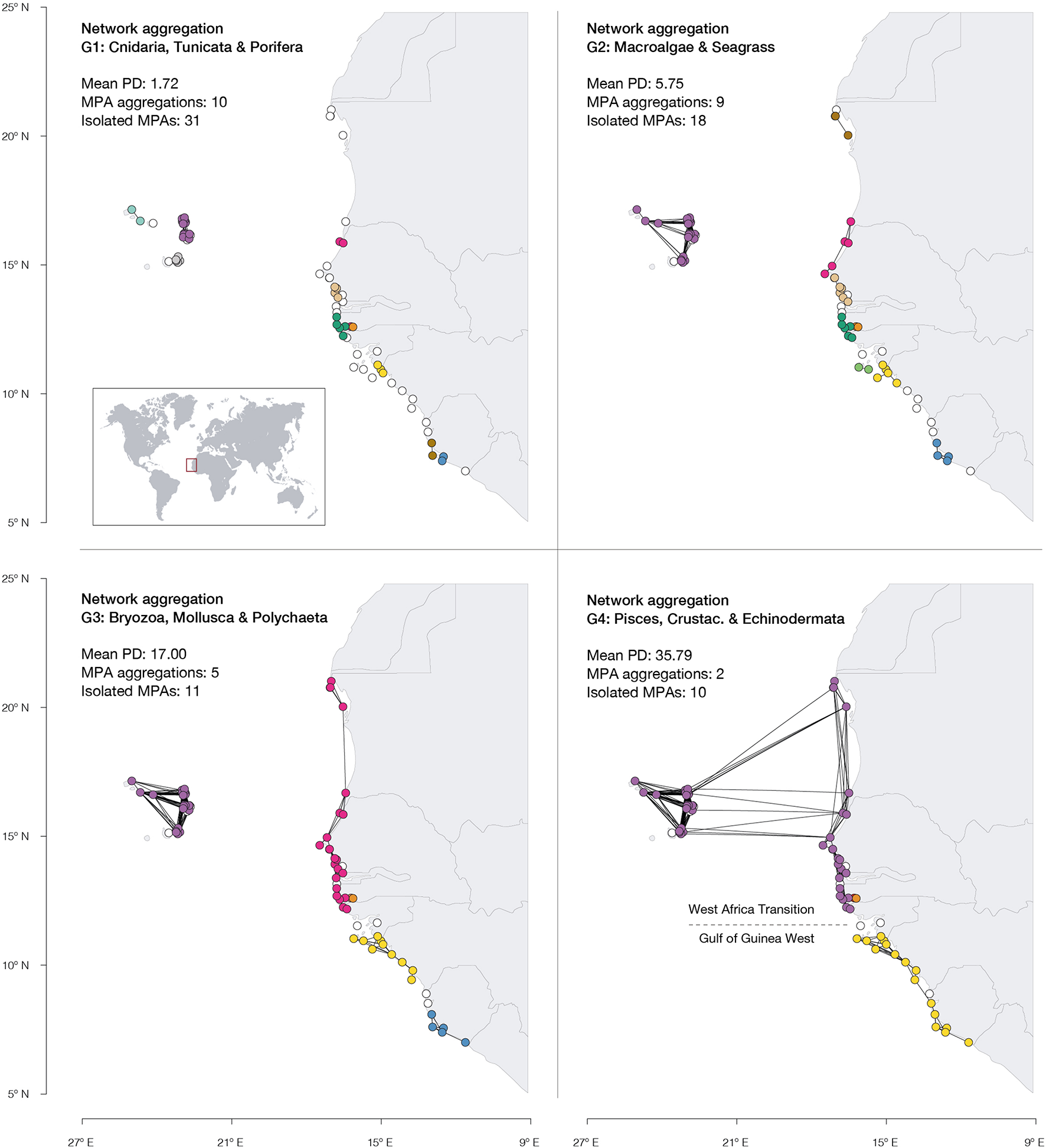 The contrasting dispersal potential (PD periods) of each ecological group was well linked to the potential connectivity of the West African MPA network. Ecological groups with shorter PD, namely G1 (Cnidaria, Tunicata, and Porifera) and G2 (Macroalgae and Seagrass), represent a more fragmented protection network (clusters: 9–10), with higher MPA isolation (no edge connections: 18–31) and less connections per MPA, on average (degree centrality: 1.53–2.82; Figure 2). The lower potential connectivity of such groups fails to link MPAs as a coherent network even within national borders. On the contrary, the longer mean PD of G3 (Bryozoa, Mollusca and Polychaeta) and G4 (Pisces, Crustacea and Echinodermata) allows population admixture between MPAs across international borders (clusters: 3–5; no edge connections: 10–11; degree centrality: 3.01– 5.41; Figure 2). In particular, the G3 taxa are linked across MPAs from Mauritania to northern Guinea Bissau, while G4 further links these with the Cape Verde MPAs, forming a broad, distinct aggregation. Also, G4 enabled the aggregation of the two southern clusters formed by the MPAs of southern Guinea-Bissau, Guinea, and Sierra Leone into one (Figure 2). Yet, even this group with higher dispersal potential retains a major gap in connectivity in central Guinea Bissau (Figure 2 and Table 1).