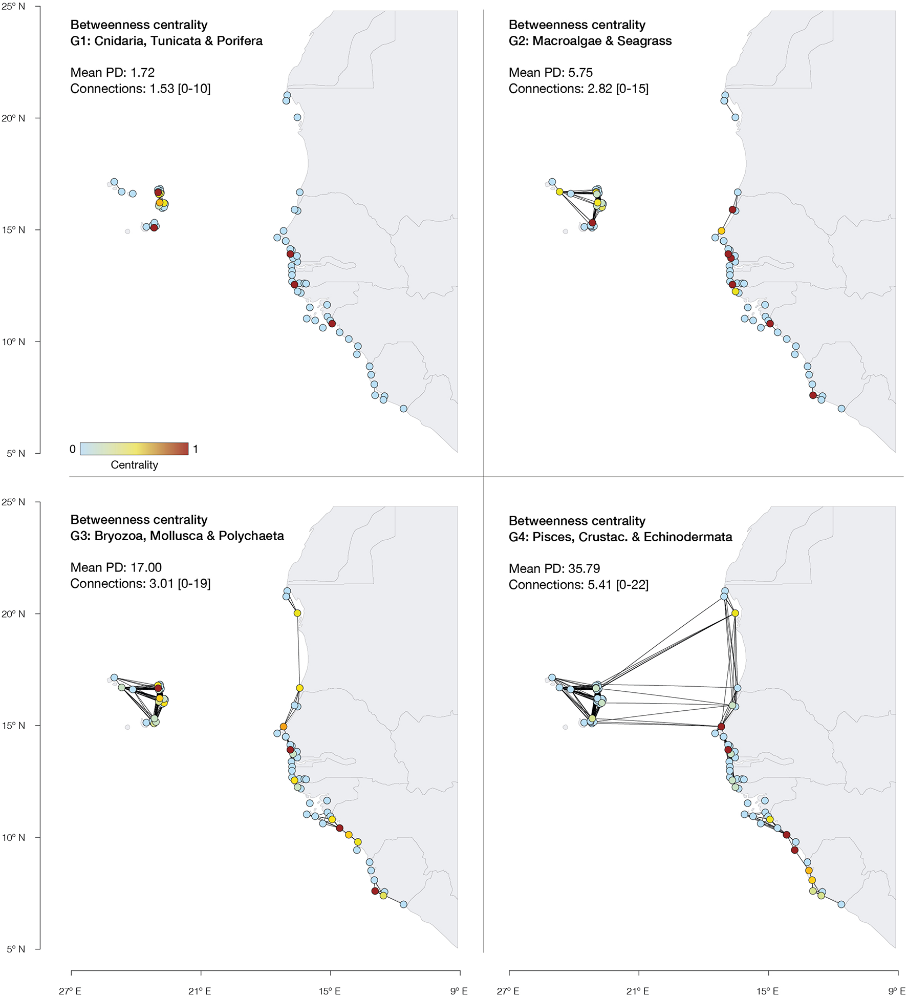 The MPAs with the highest betweenness centrality, thus contributing for migratory flow between more MPAs, were identified along the shorelines of Cape Verde archipelago, Senegal, Guinea and Sierra Leone for G1, G2, and G3. For G4, higher centrality was identified in Senegal, Guinea and Sierra Leone.