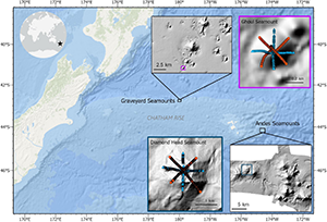 The ‘Graveyard’ and ‘Andes’ seamount complexes were surveyed in 2015 as part of a broader study examining the impacts of fishing on seamount benthic communities and their recovery potential (Clark and Rowden, 2009; Clark et al., 2010a, 2019; Williams et al., 2010; Figure 1). Both seamount complexes are located on Chatham Rise, a submarine continental ridge extending approximately 1,000 km east from South Island, New Zealand. Situated below the Subtropical Front, Chatham Rise is a highly productive region (Murphy et al., 2001; Sutton, 2001) with high benthic biodiversity and biomass (Nodder et al., 2012). Commercial deep-water trawl fisheries for orange roughy (Hoplostethus atlanticus), oreo (Allocytus niger and Pseudocyttus maculatus), and alfonsino (Beryx splendens) target Chatham Rise seamounts (Clark and O’Driscoll, 2003; O’Driscoll and Clark, 2005; Clark et al., 2010b).