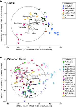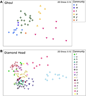 Hierarchical clustering with SIMPROF analysis identified 6 communities on Ghoul and 16 communities on Diamond Head. Of these, community v from Ghoul and community k from Diamond Head each comprised single samples. The nMDS plots showed that Ghoul communities generally formed relatively dispersed but distinct clusters (Figure 2A). In contrast, Diamond Head communities were more tightly clustered, but with an apparent separation between the more dispersed clusters for communities p and o and the remaining 14 communities (Figure 2B).