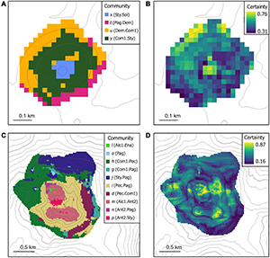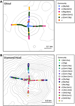 Spatial distribution patterns of the benthic communities varied between the seamounts (Figure 4). Communities on Ghoul were distributed by depth and aspect (side) of the seamount: community × (Sty.Sol) occurred on the summit; community y (Com1.Sty) on the upper to mid-flanks on all four sides; community u (Dem.Com1) mostly on the lower flanks on the north and west sides; community t (Pag.Dem) on the lower flanks of the south/east sides, and communities w (Sty.Com1) and v only occurred on the upper flank of the north side. The benthic communities on Diamond Head were also distributed by depth and broad-scale aspect, but depth-related patterns among communities were less distinct than on Ghoul. The summit of Diamond Head was mostly occupied by communities p (Ant2.Sty), m (Alc1.Ant2), n (Ant2.Pag), and l (Alc1.Ena). Community distribution on the flanks was more variable. Community o (Pag.) mostly occurred on the upper flanks along a concave rim on the north, south, and west sides. The distributions of several communities were limited to one seamount side: community d (Pec.Com1) on the lower flanks of the east side; community h (Com1.Pec), f (Pri6.Com1), and c (Com1.Dem) on a small pinnacle on the west side; community b (Dem.Com1) and g (Com1.Pag) on the lower flanks of the north side. Community i (Pec.Pag) was distributed on the east, south, and west sides at varying depths along the seamount. Community k comprised a single sample which occurred on a pinnacle on the south side.